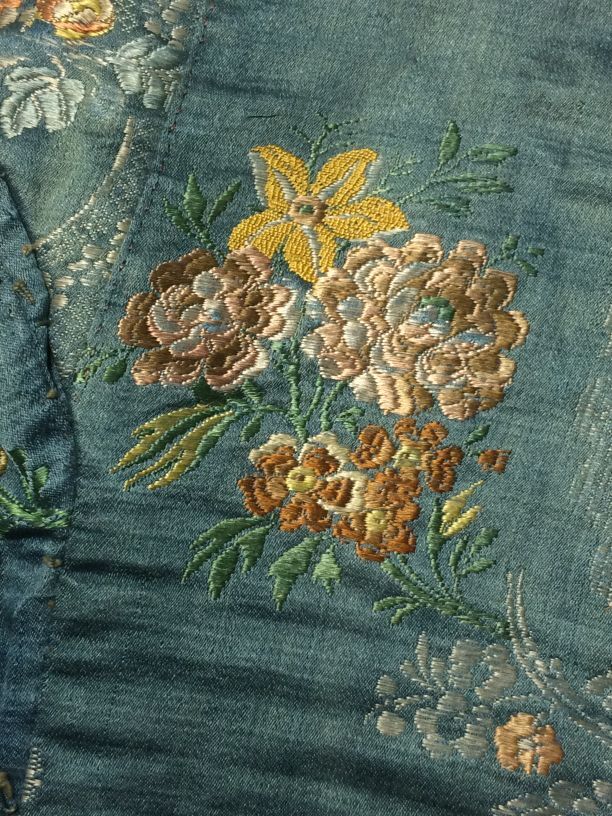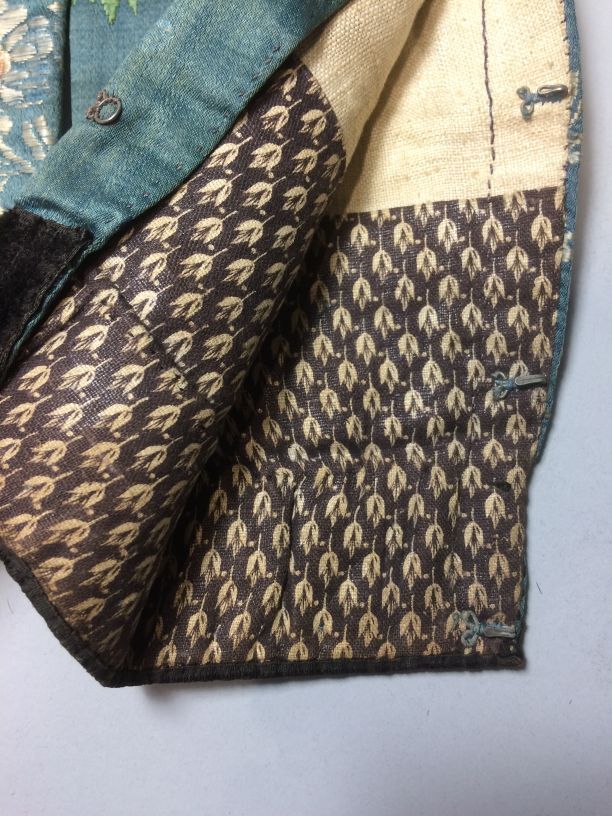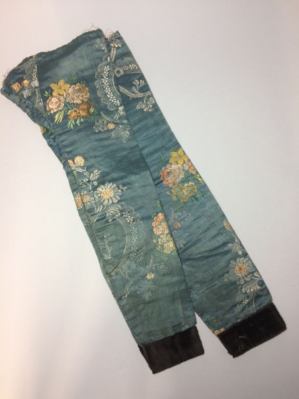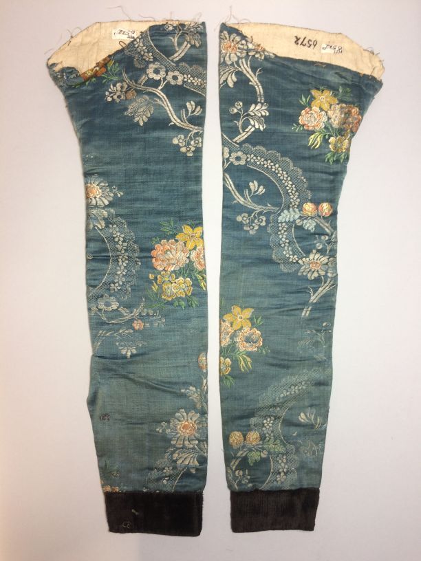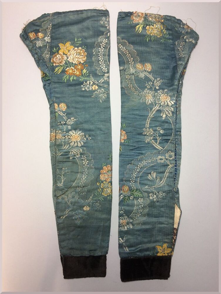 Paar mouwen van blauwe zijdelancé, gevoerd met wit vrij grof katoen