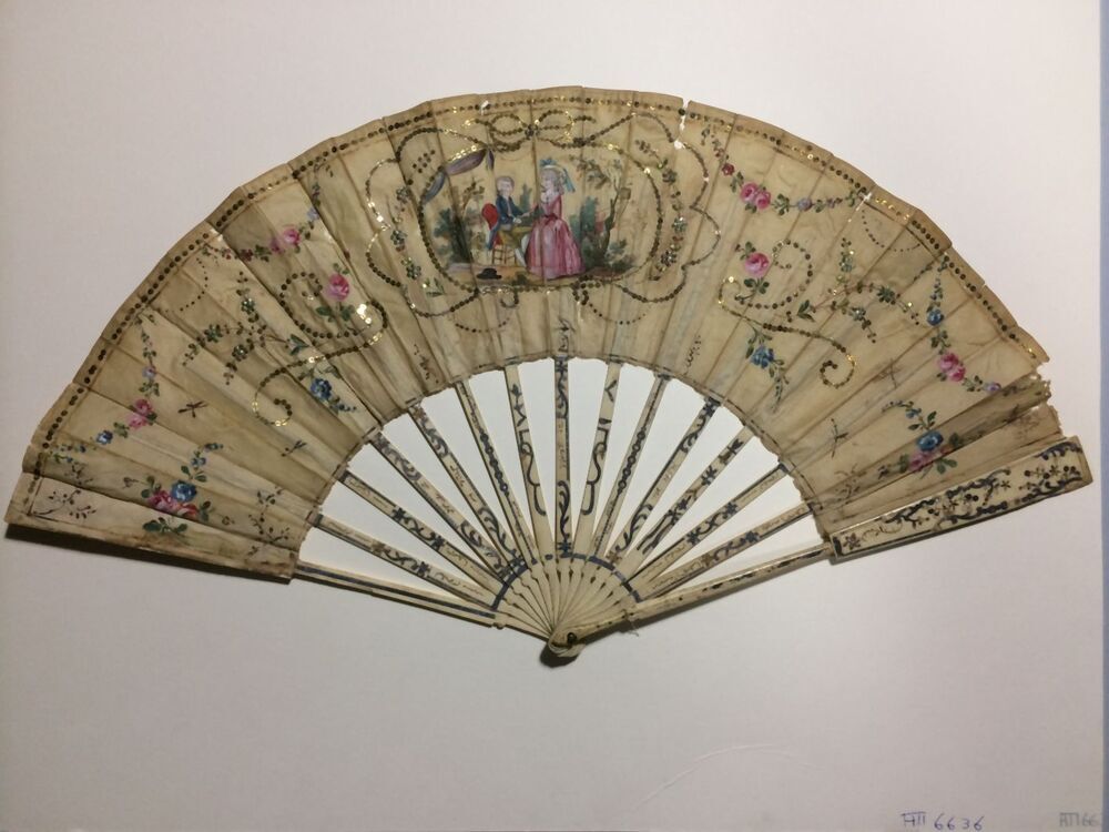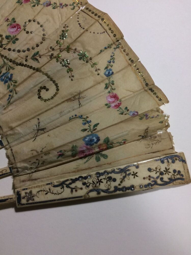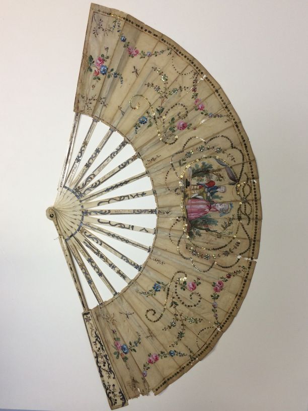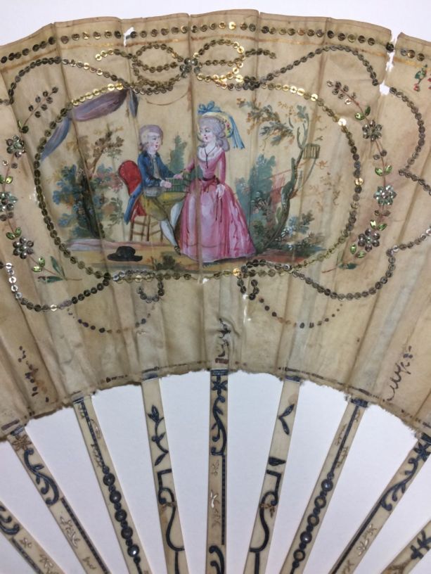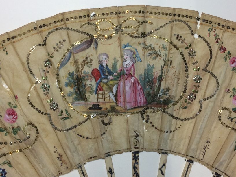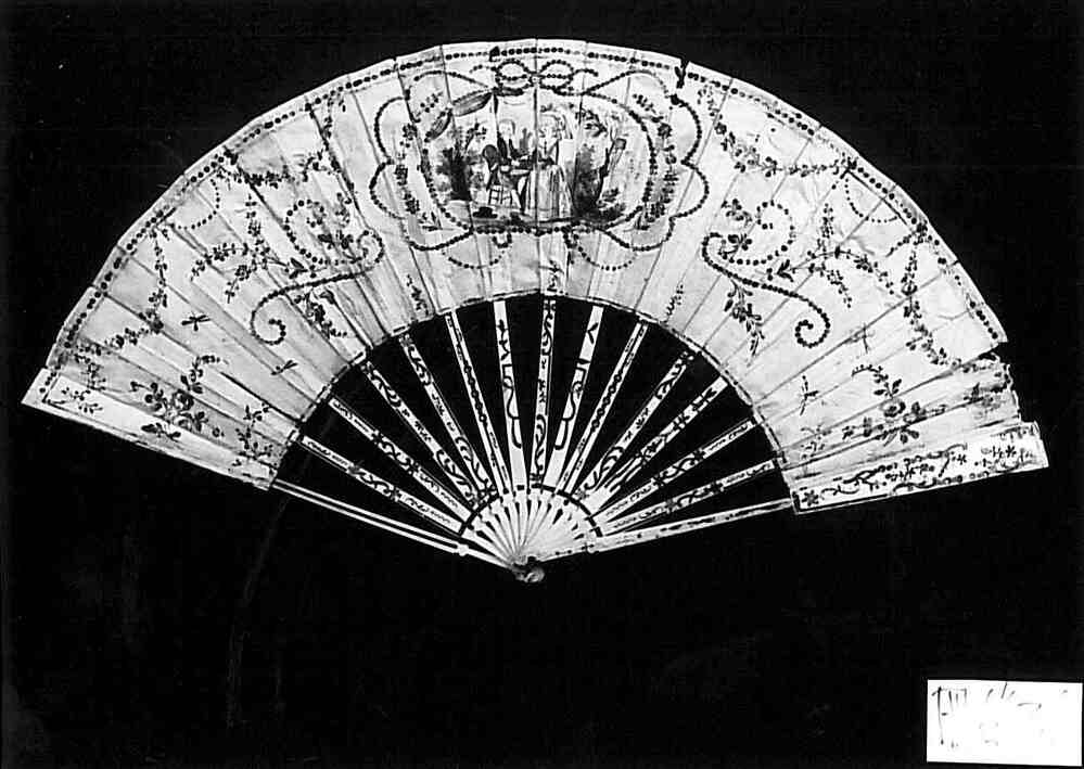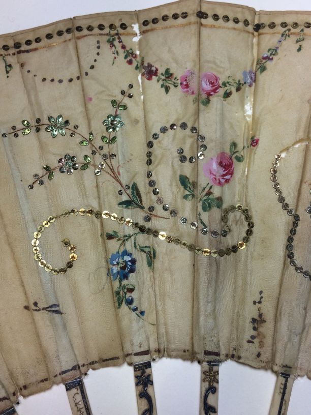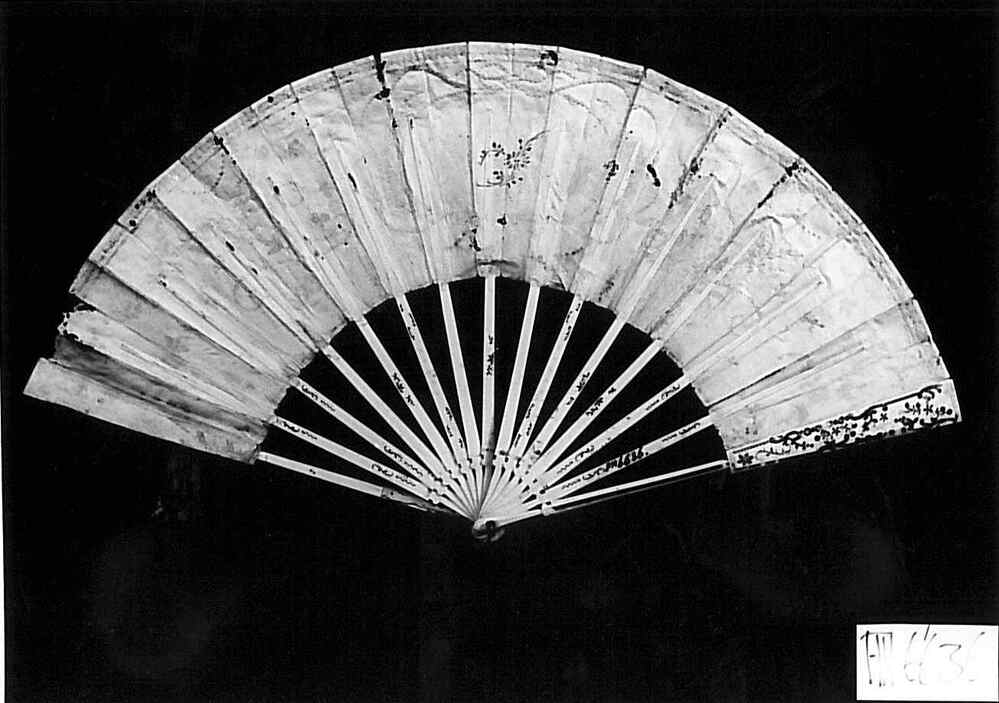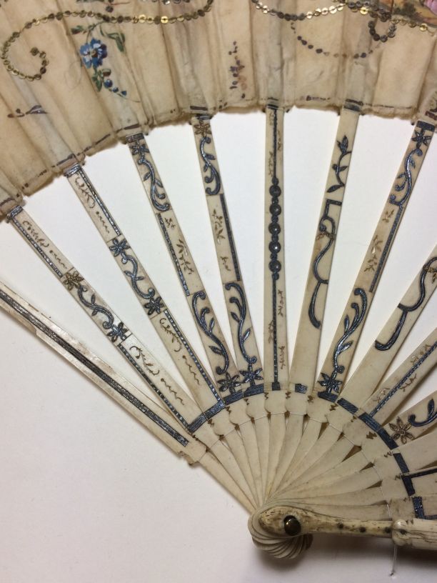 Waaier met benen montuur en zijden blad met pailletten, buitenbenen ingelegd met zilver, briljantjes en rode steentjes