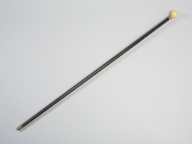 Achtkante ebbenhouten wandelstok met maataanduiding, naar de punt toelopend en voorzien van blikken busje