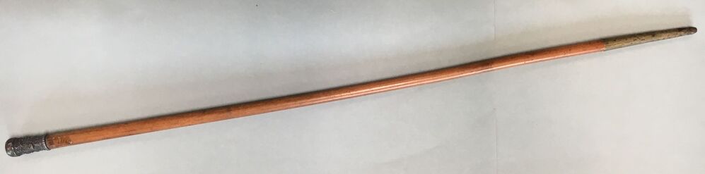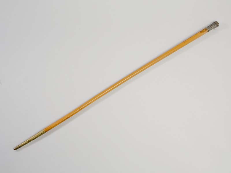 Wandelstok met op het eind een zilveren knop versierd met bloemwerk. Op het ondereind koperen punt