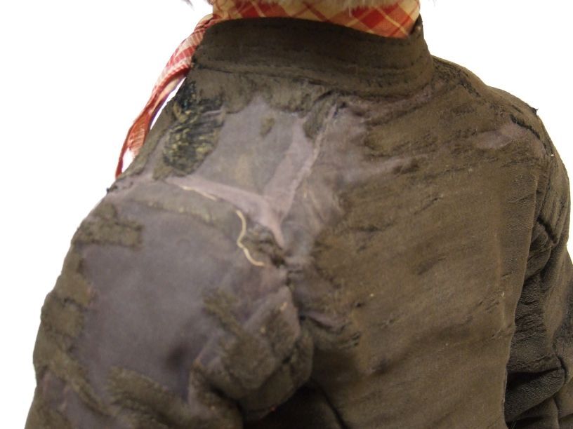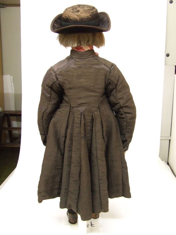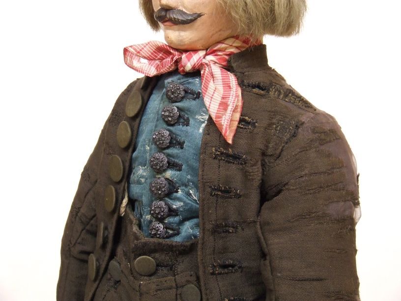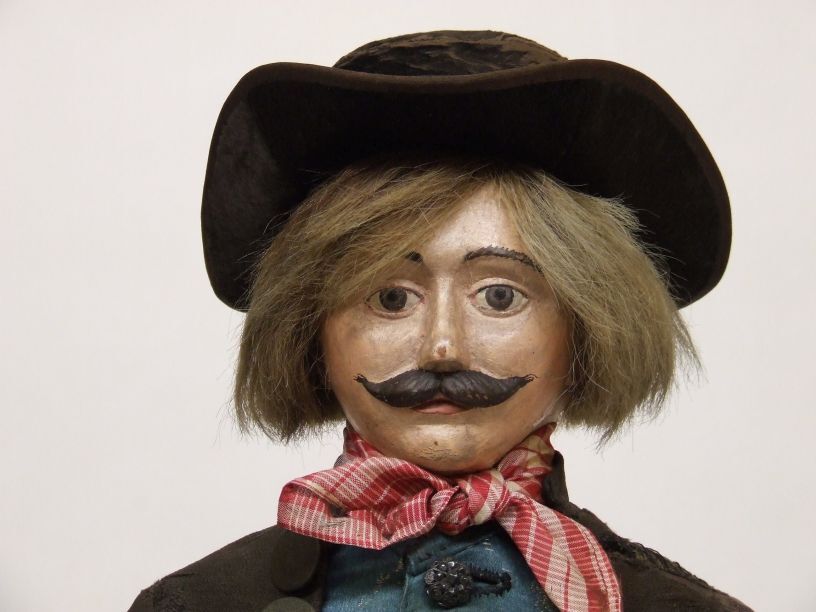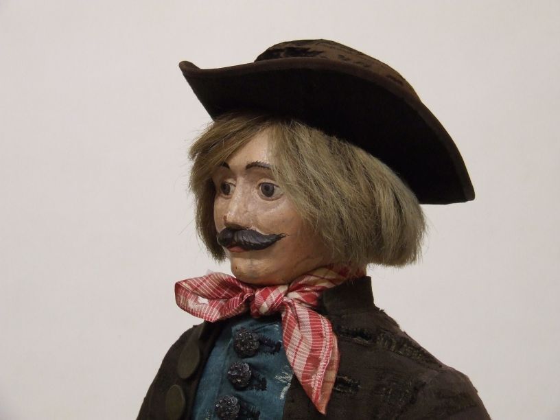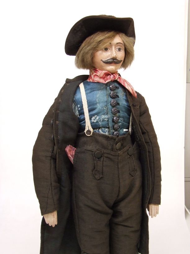 Houten mannenpop met blond haar en snor, in Hindelooper kostuum