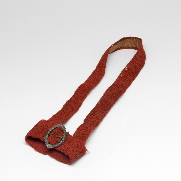 Band-tuigje van rode wol met gesp, onderdeel van kostuum pop