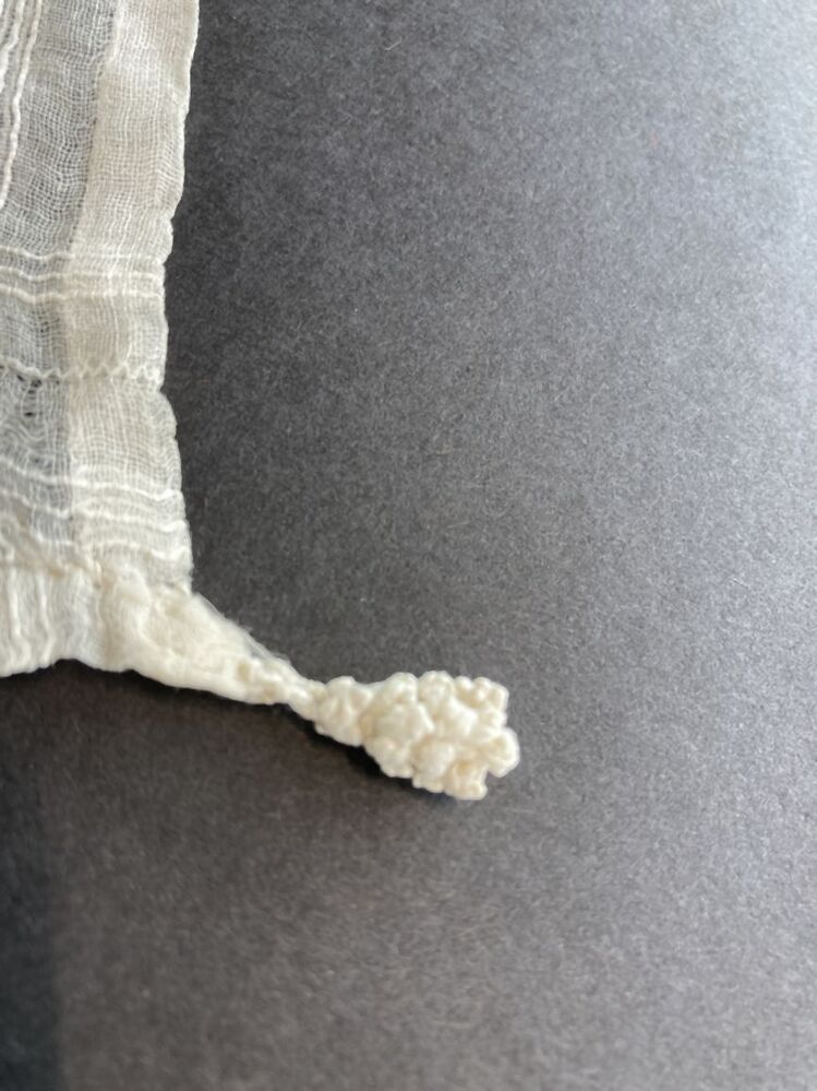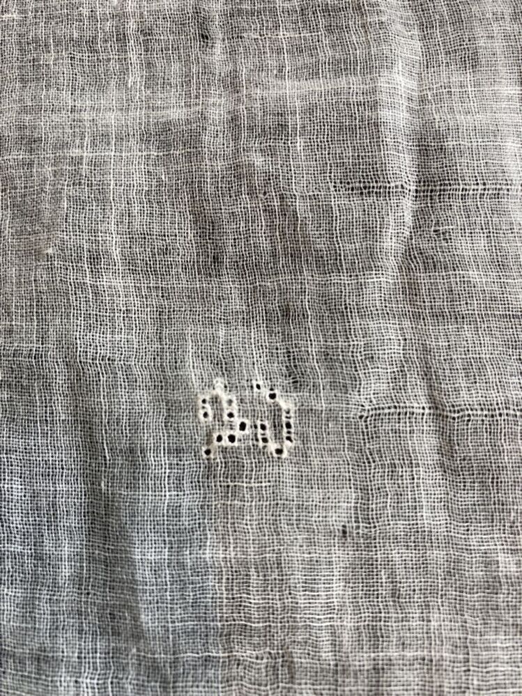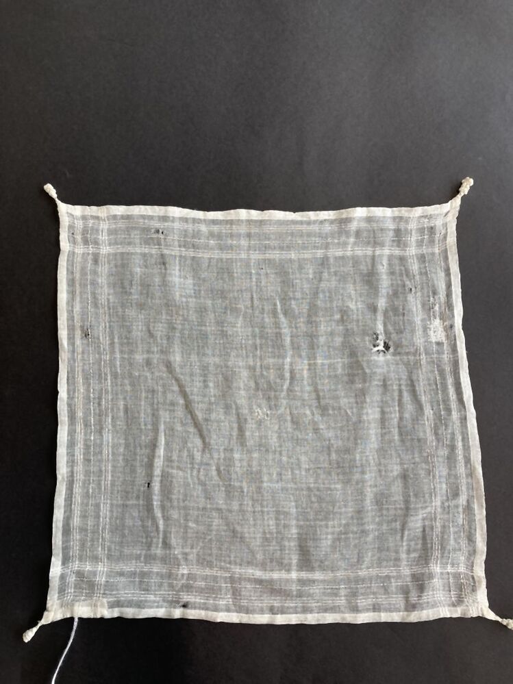 Zakdoekje van zeer opengeweven linnen neteldoek met 4 akertjes , onderdeel van aankleding pop in Hindelooper kostuum