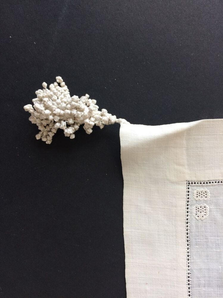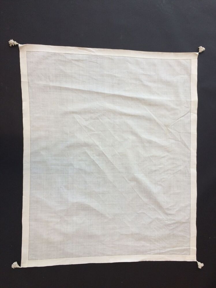 Halsoek van fijn wit linnen met vier akers op de hoeken, met initalen IE