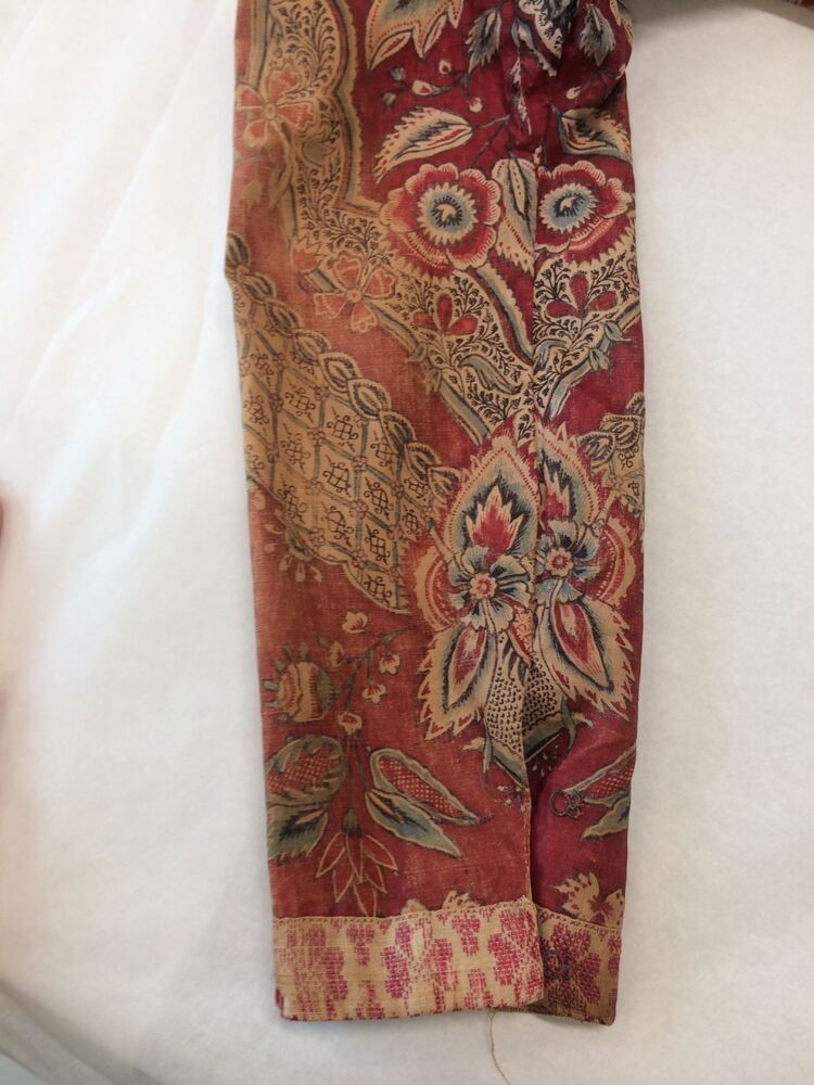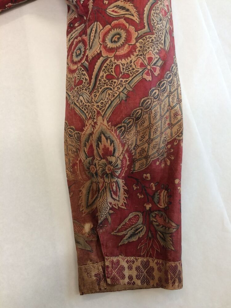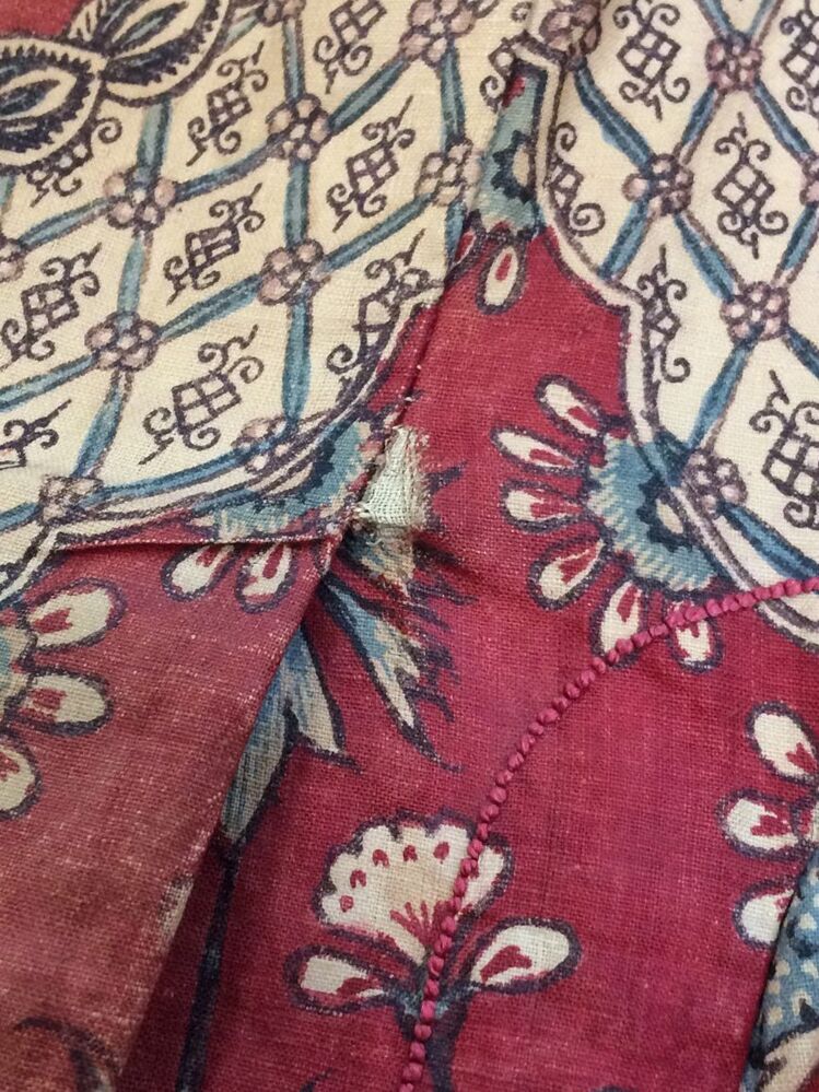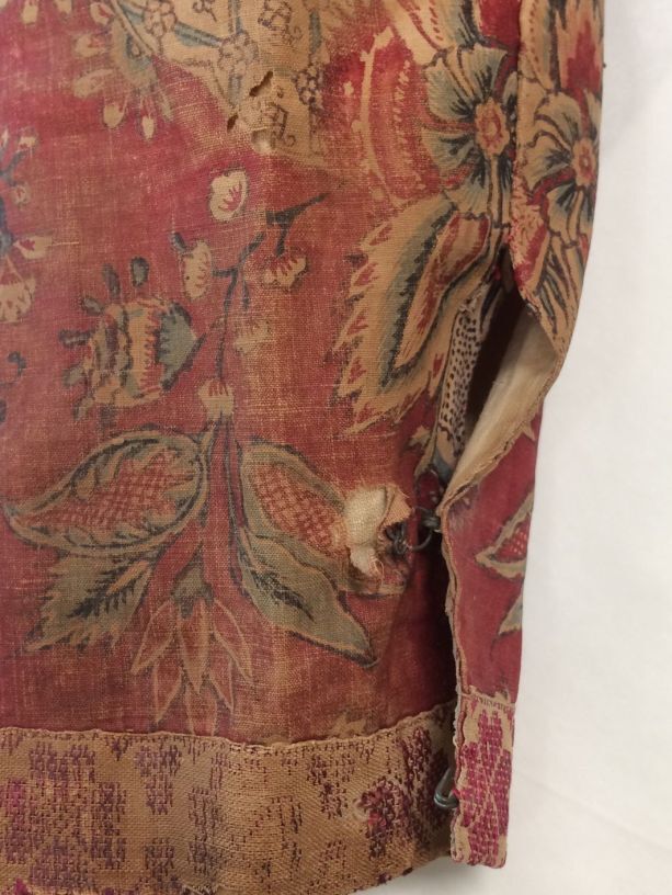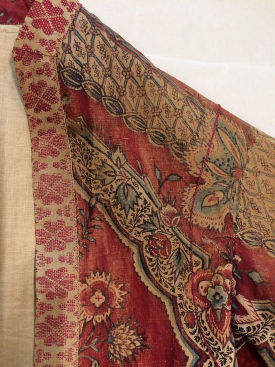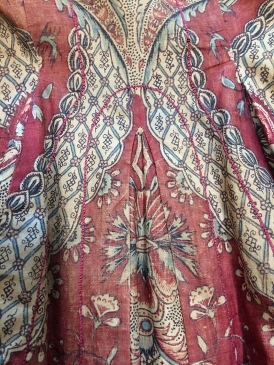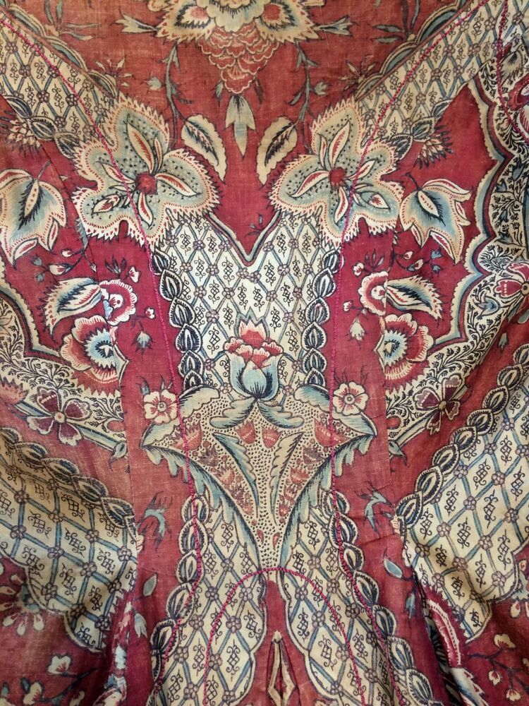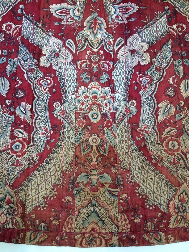 Sitsen Hindeloper wentke, vrouwenjas, met symmetrische medaillons met palmetmotieven en bloemranken op rode grond