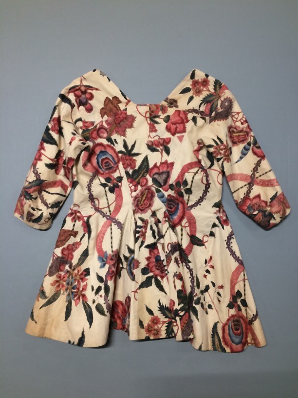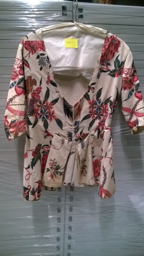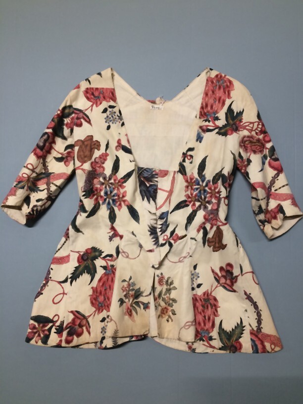 Sitsen vrouwenjak, beschilderd met herhaald patroon van drie om elkaar slingerende banden met bloemmotieven op witte grond.