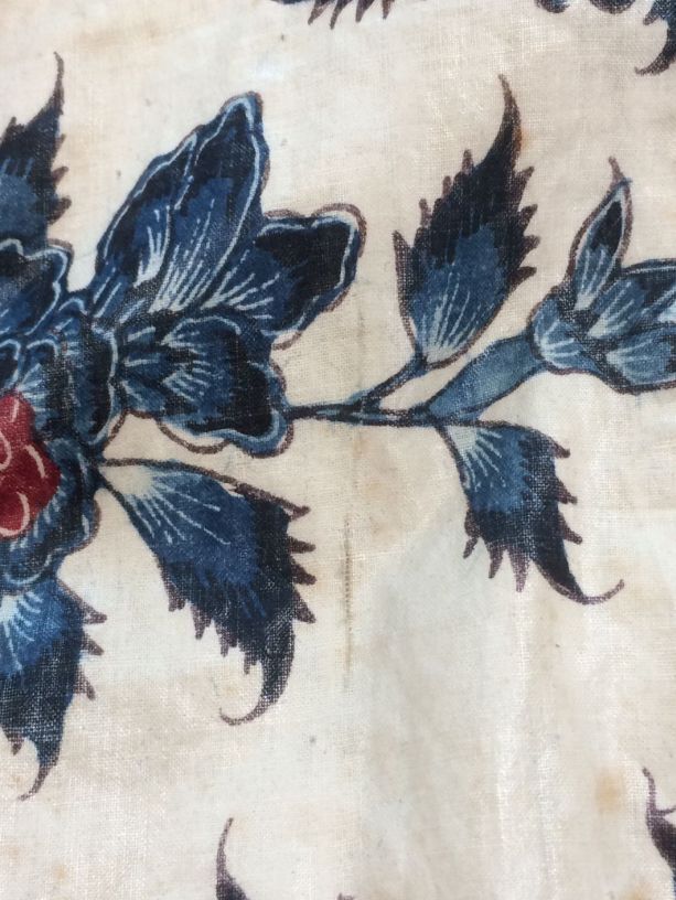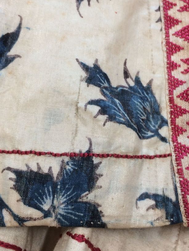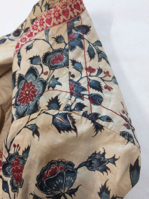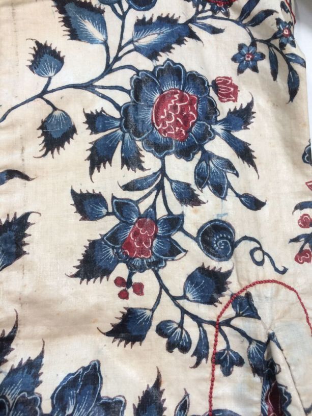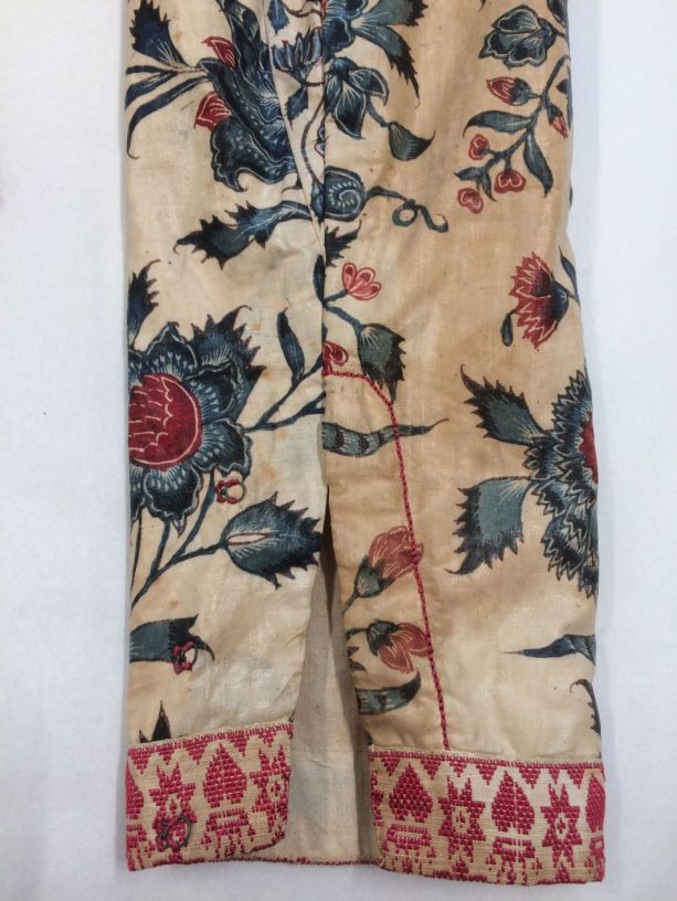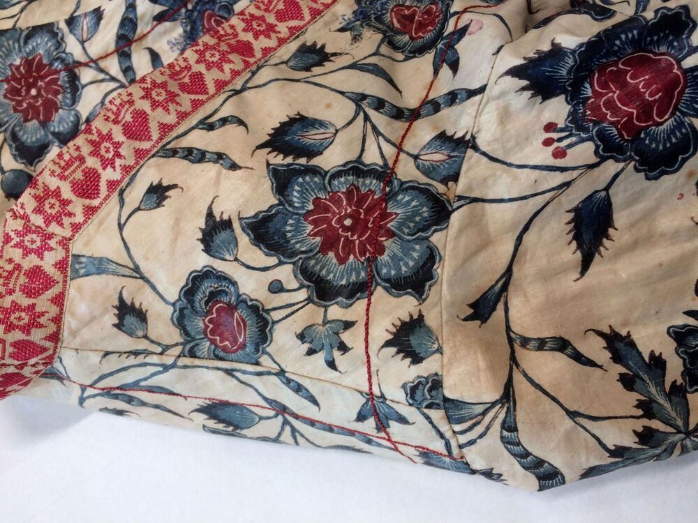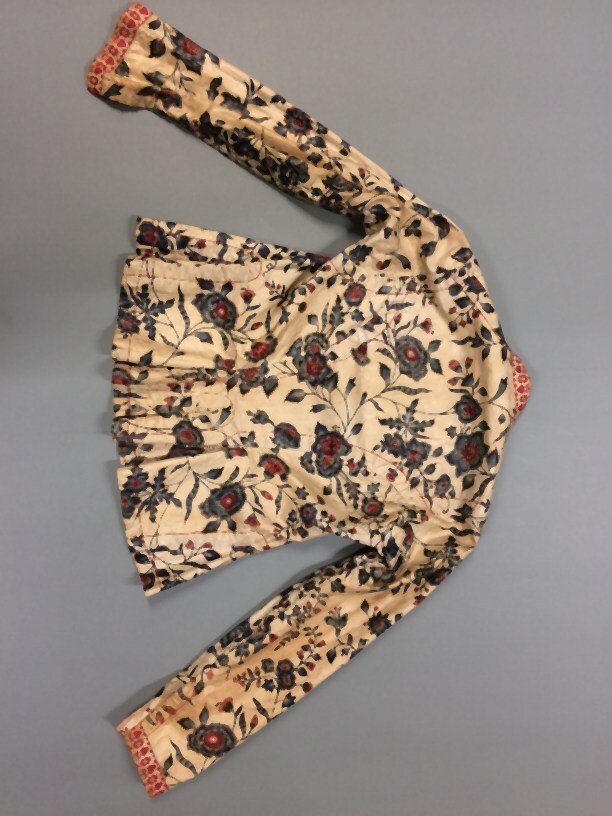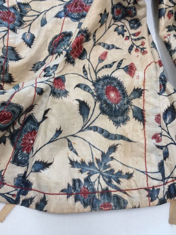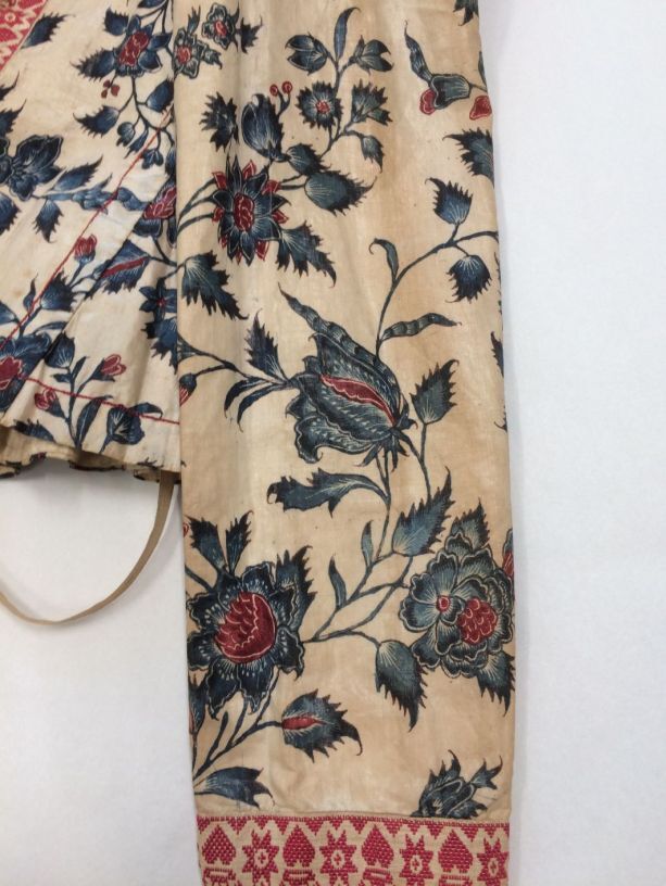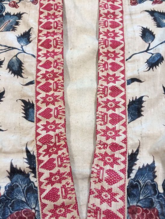 Sitsen Hindeloper kassakijntje, kort jakje, afgezet met rood-wit langetband, van sits met blauw bloemmotief met rode harten. rood- op witte grond