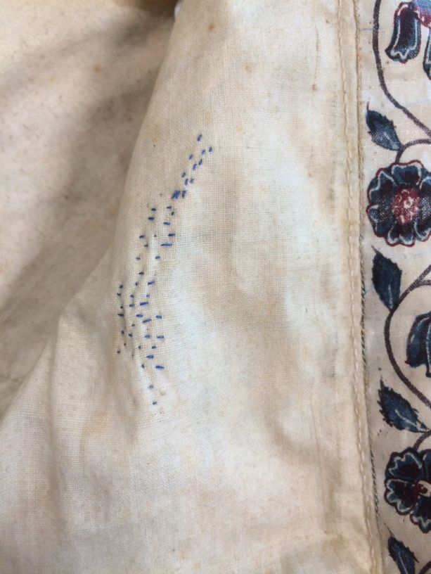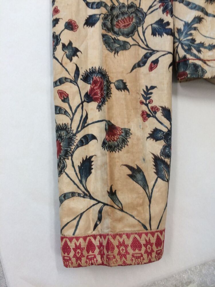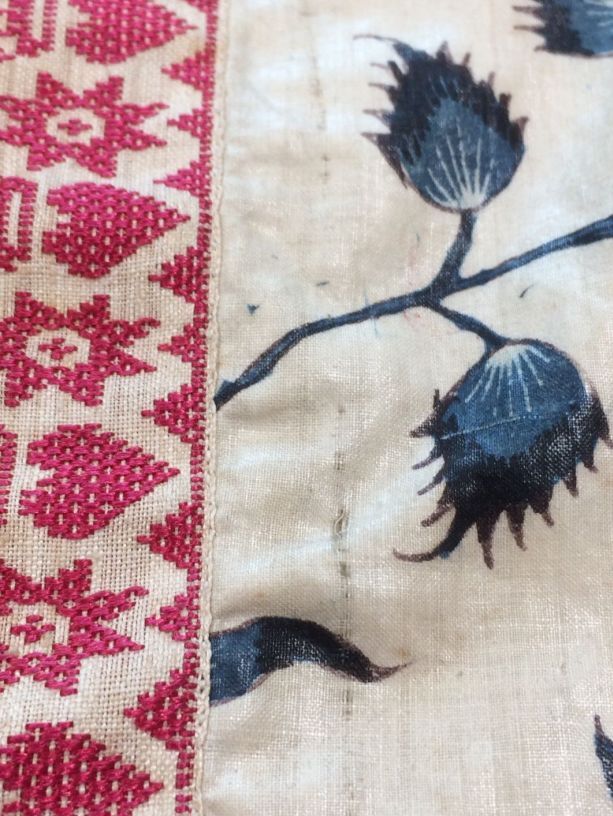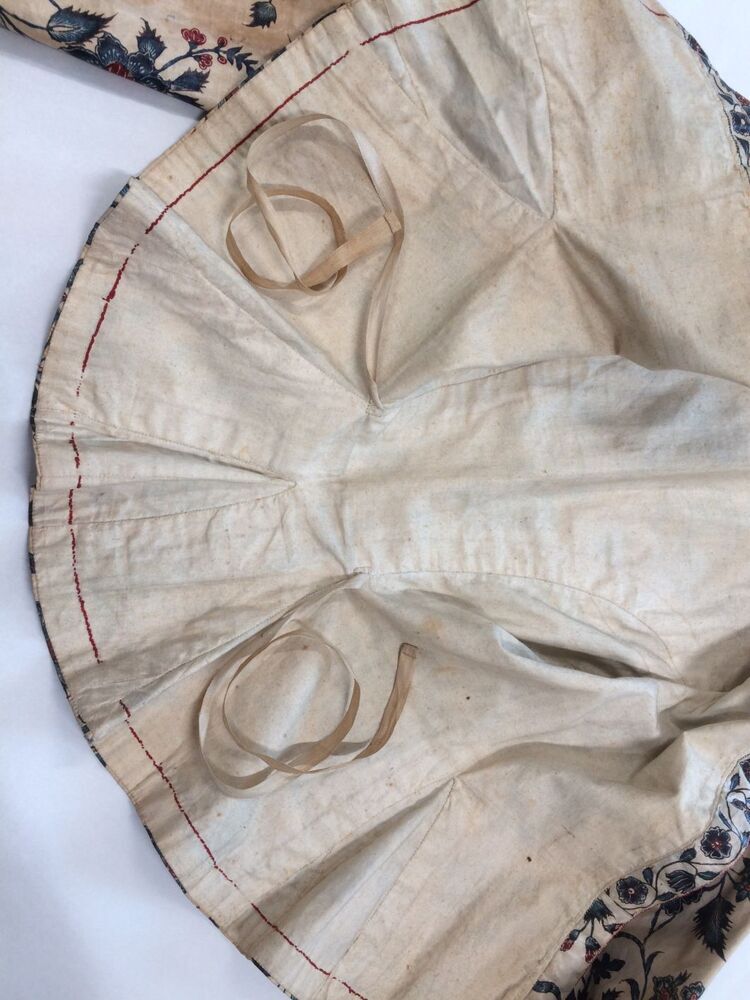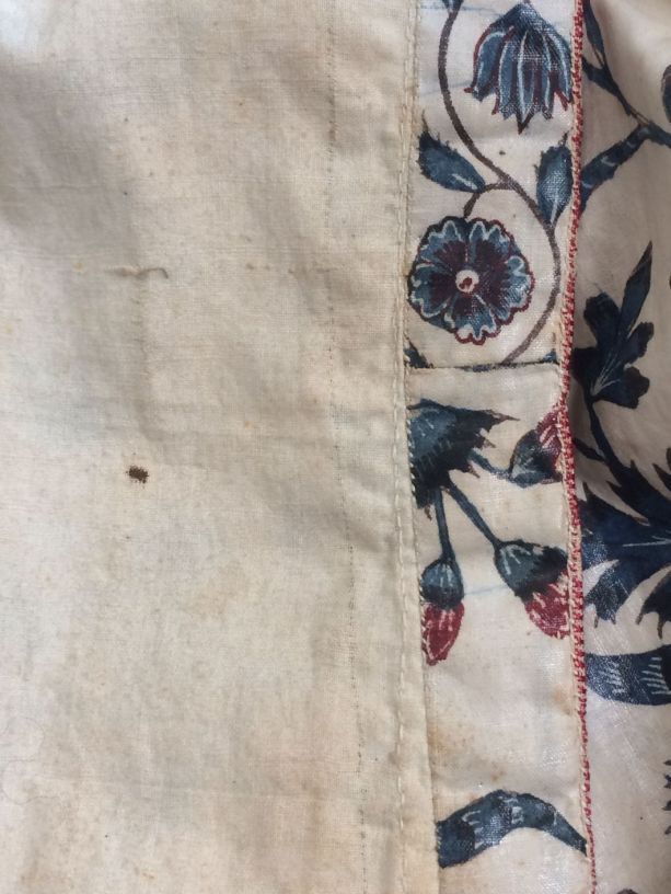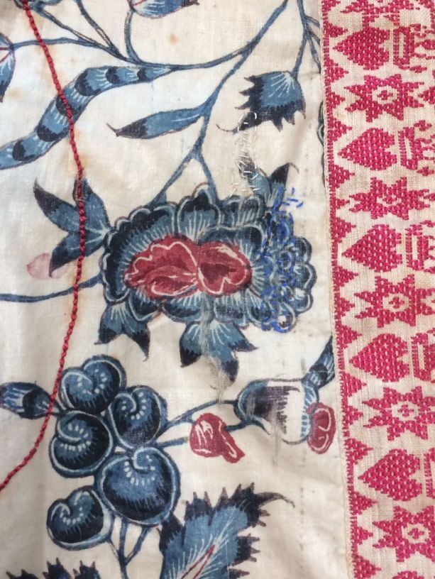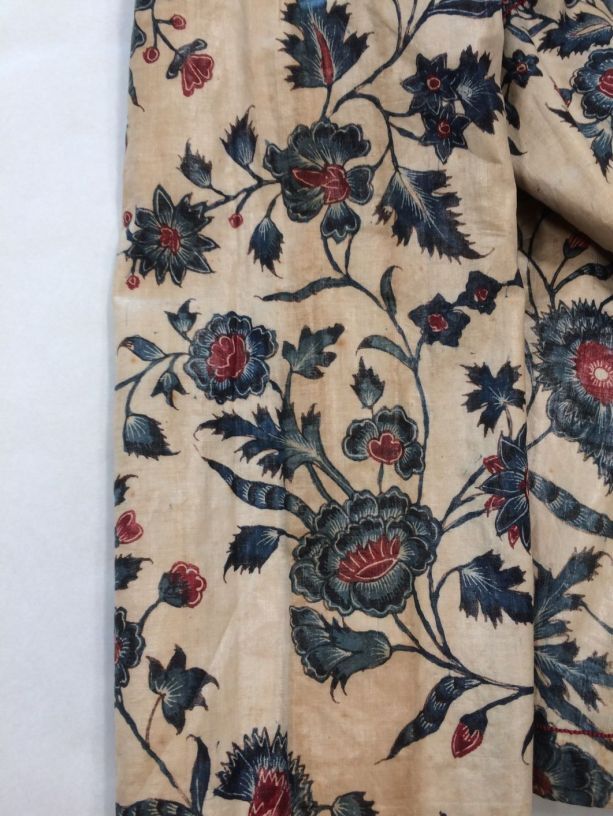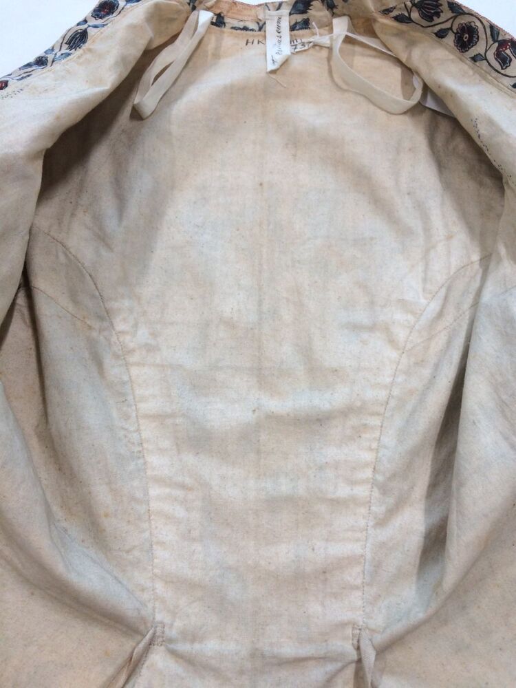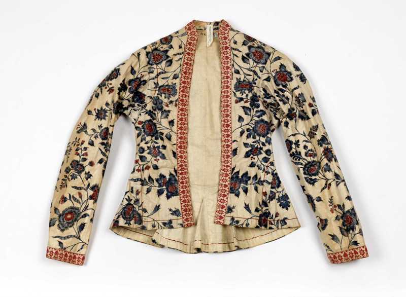 Sitsen Hindeloper kassakijntje, kort jakje, afgezet met rood-wit langetband, van sits met blauw bloemmotief met rode harten. rood- op witte grond