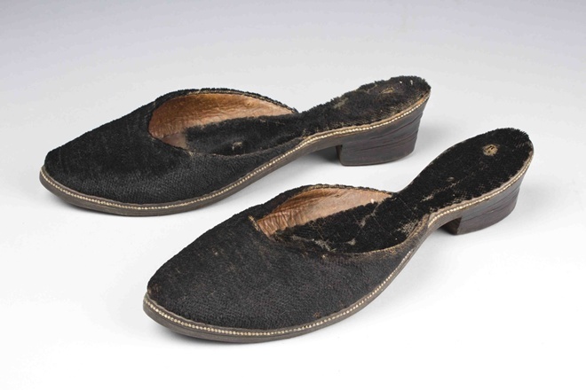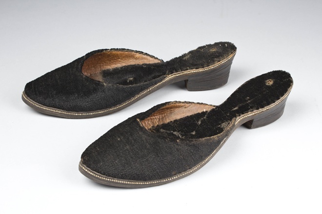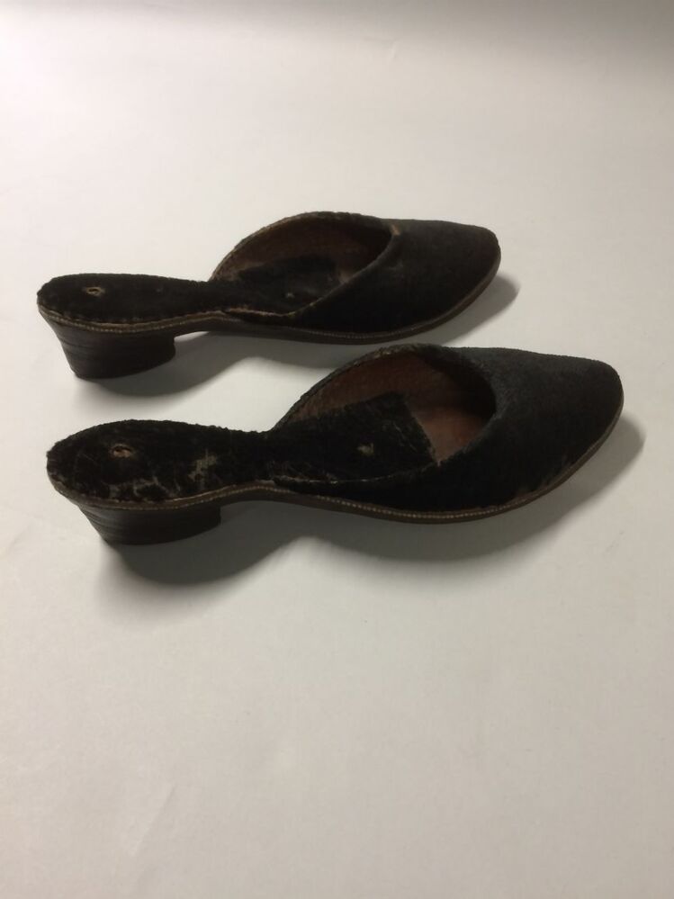 Muil, onderdeel van een paar muilen met leren zool en hak, spitse snuit, bovenwerk zwart trijp