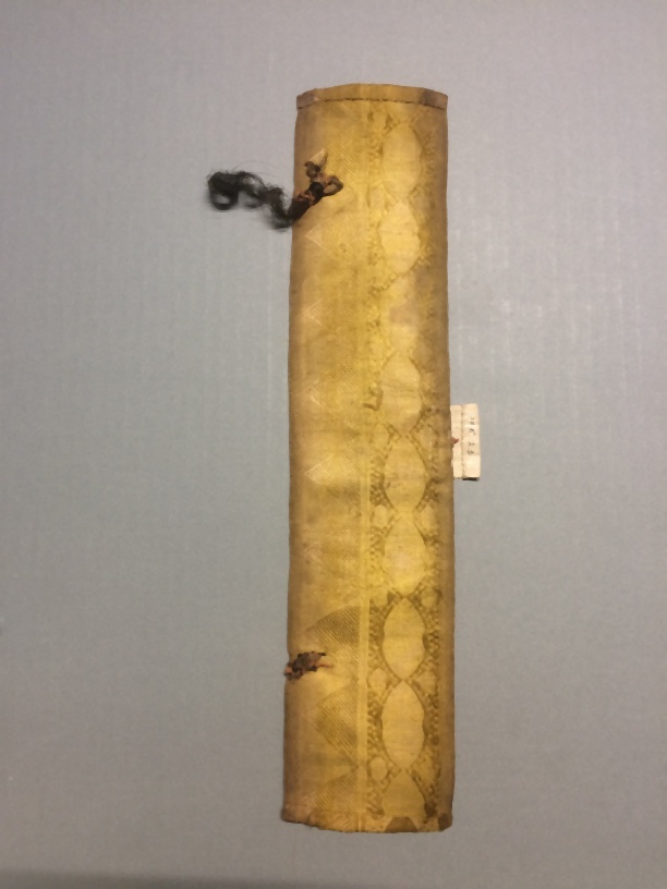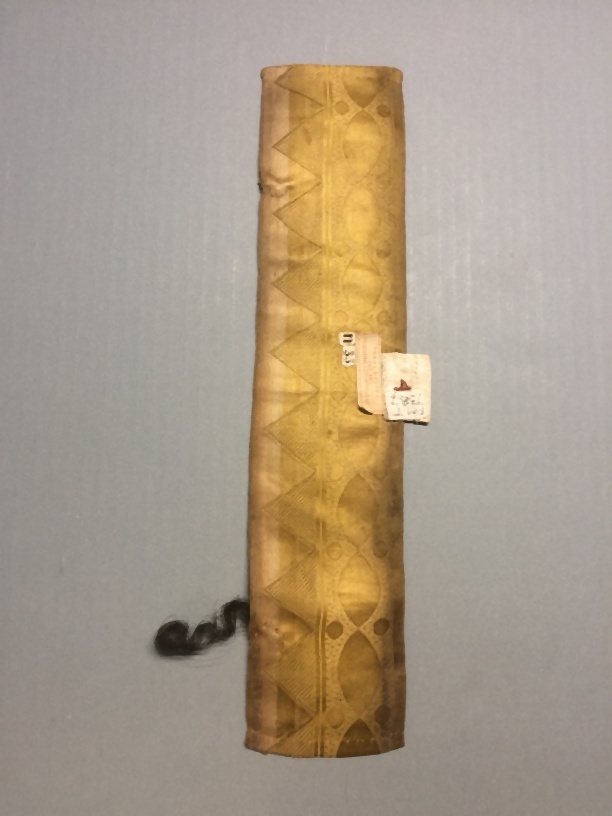 Lint van mosterdgele zijde met ingeweven patroon van spitsovalen en punten, met linnen lipje, gemerkt 4