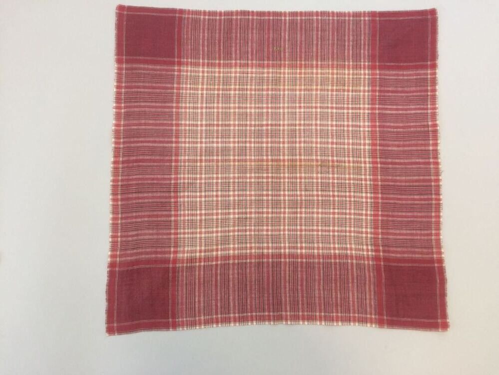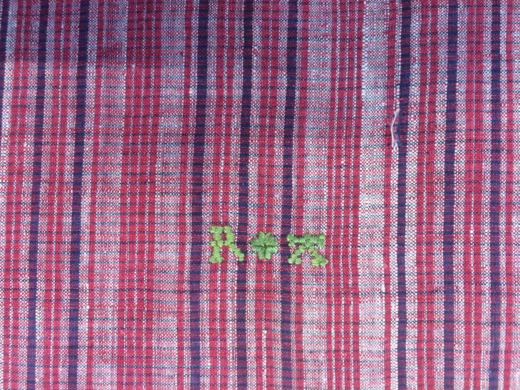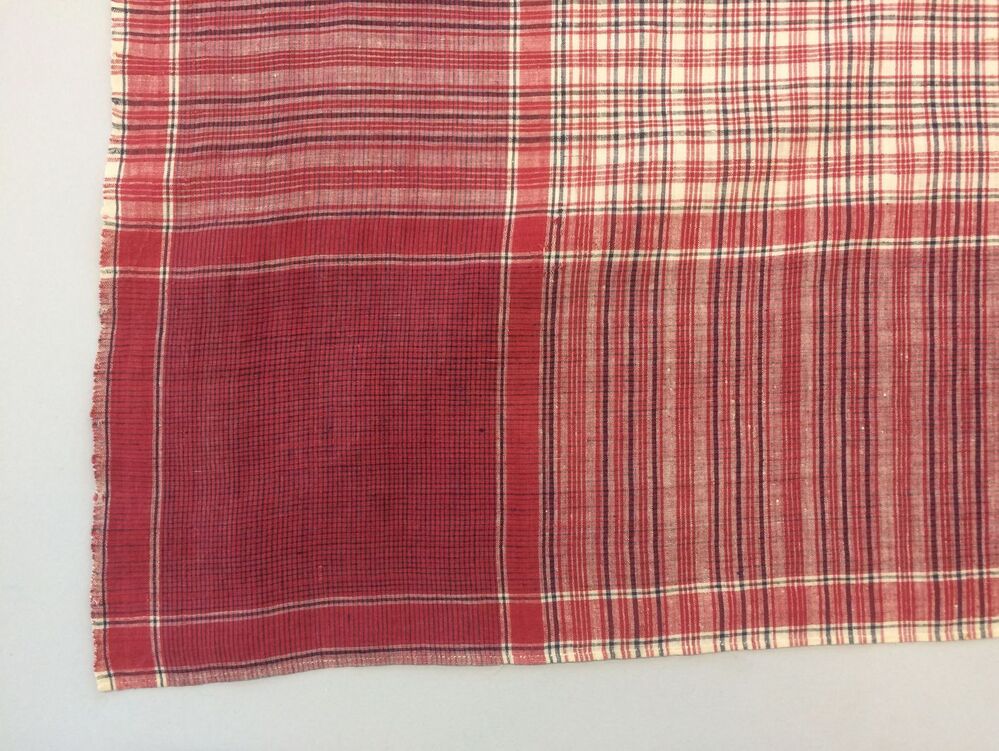 Hindelooper sondook met ingeweven ruit en lapkede, ingeweven rand rondom, in wit, rood en blauw en initialen R A