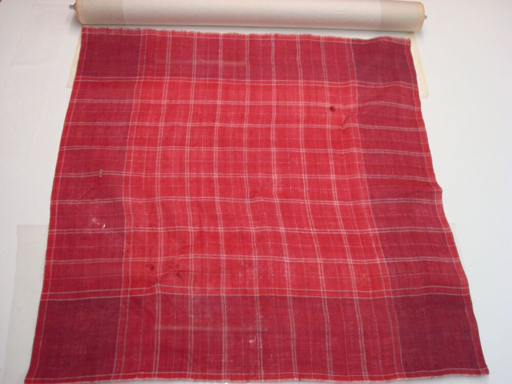 Hindelooper rode sondook met ingeweven ruit in wit en blauw 'lapkede mei kouhoarnde' en geborduurde initialen F F