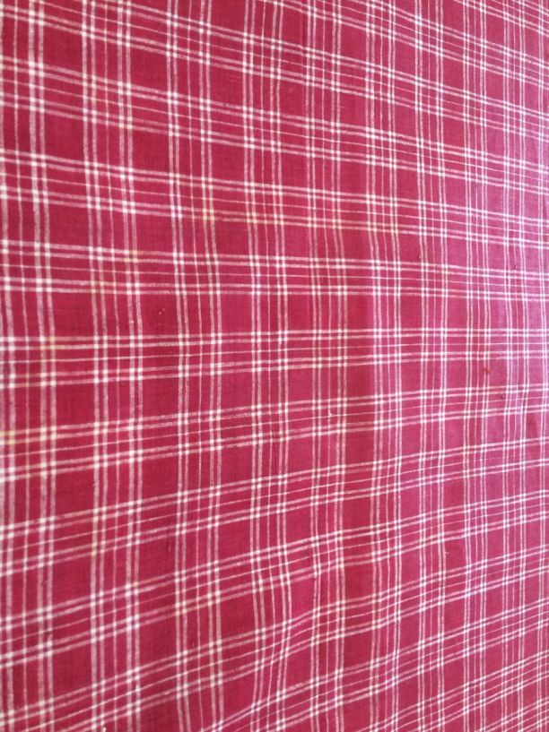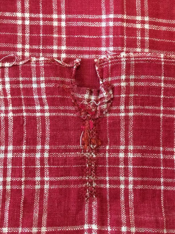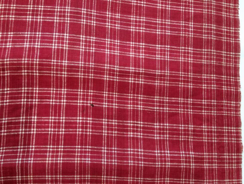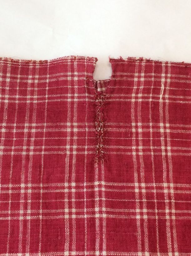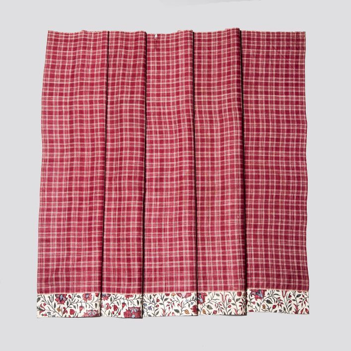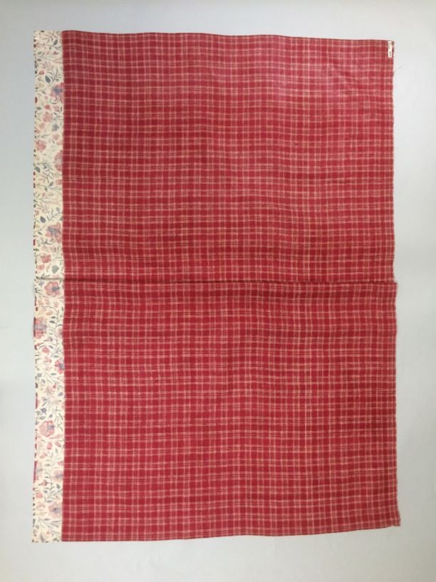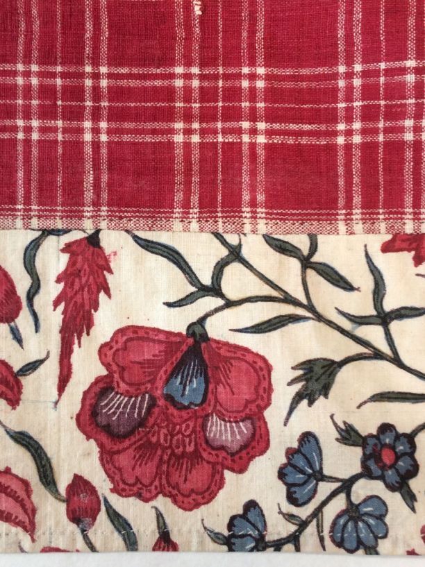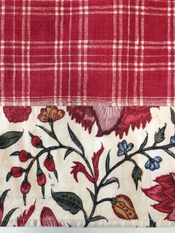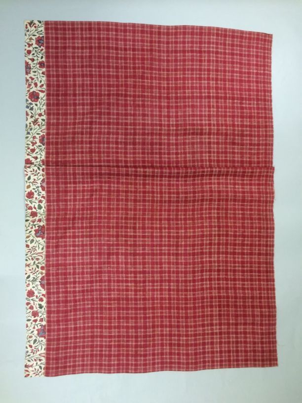 Schort van bont van het staal Pioenede mei blauw (rood), met sitsen zoomrand