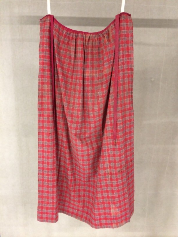 Skerteldook met rode grond waarop brede blauw-wit bundels ruiten vormen