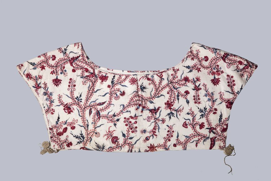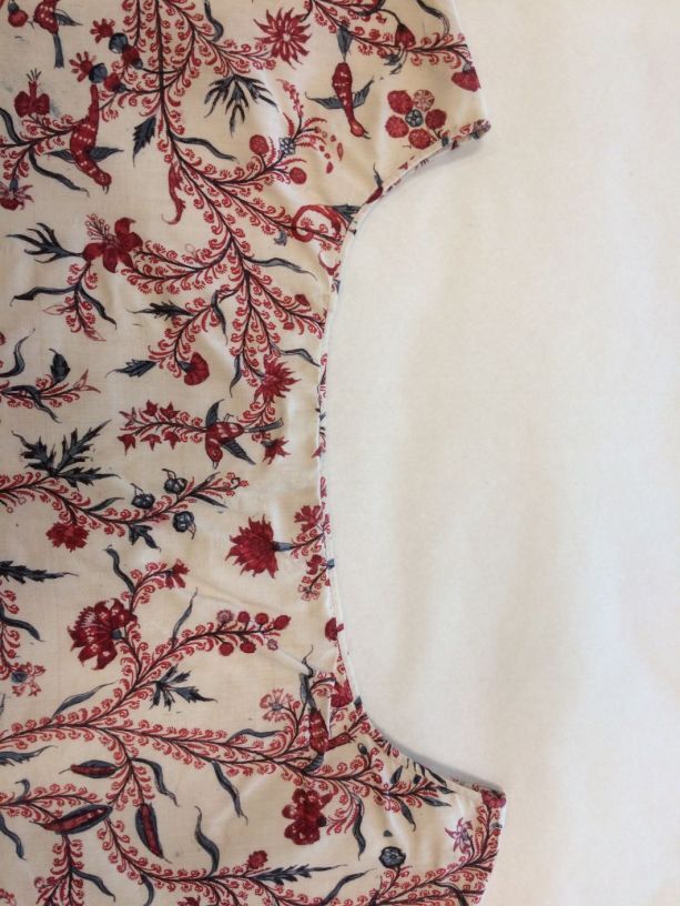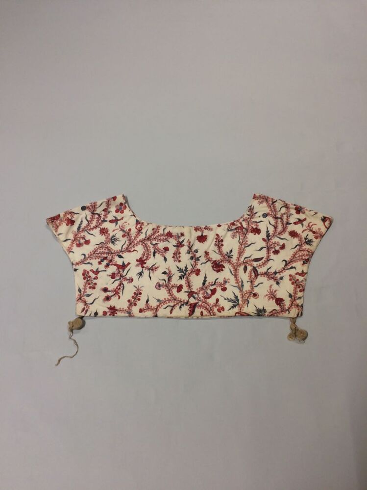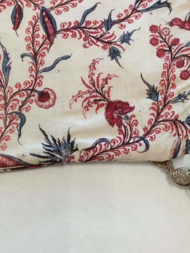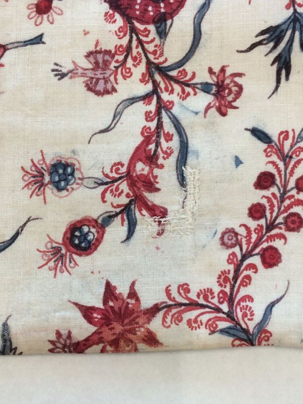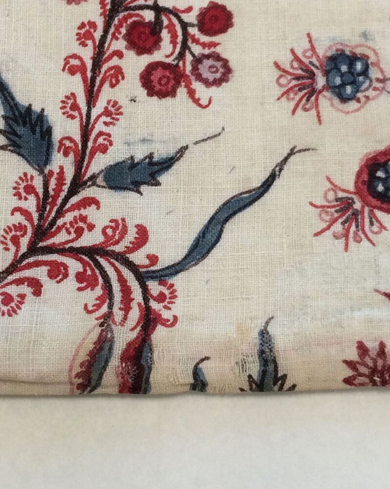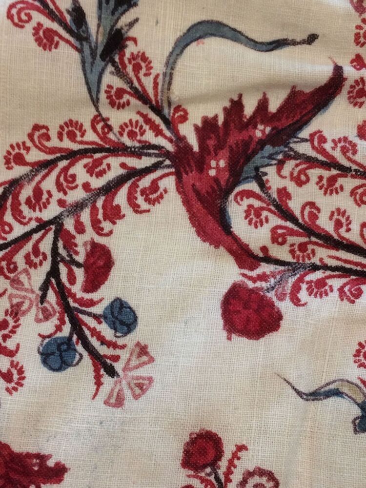 Sitsen vrouwenkroplap ofwel onderst, met dunne wuivende ranken met rode pluisjes, kleine bloemen en vogeltjes op witte grond