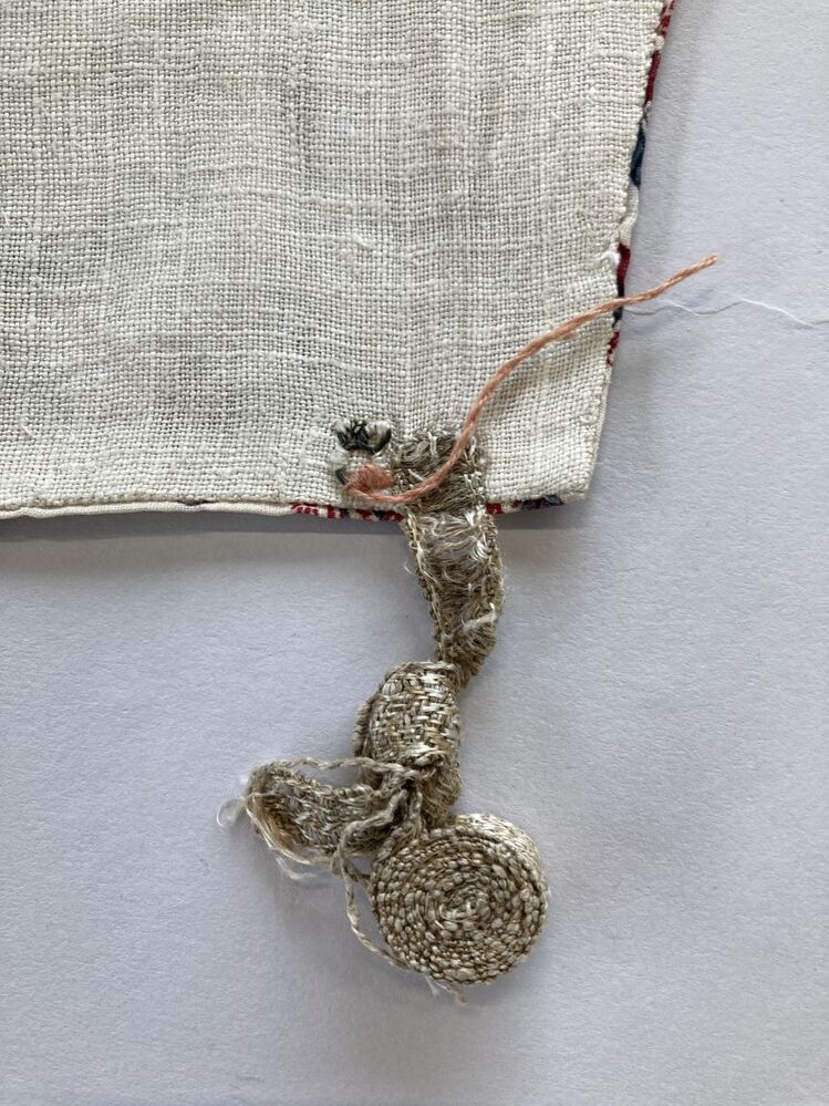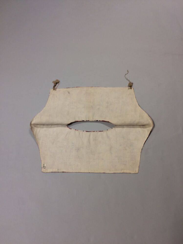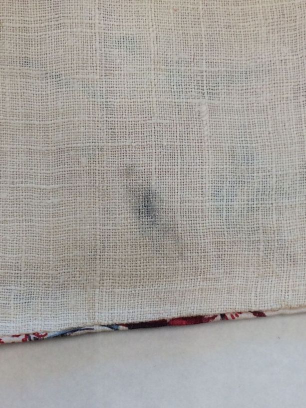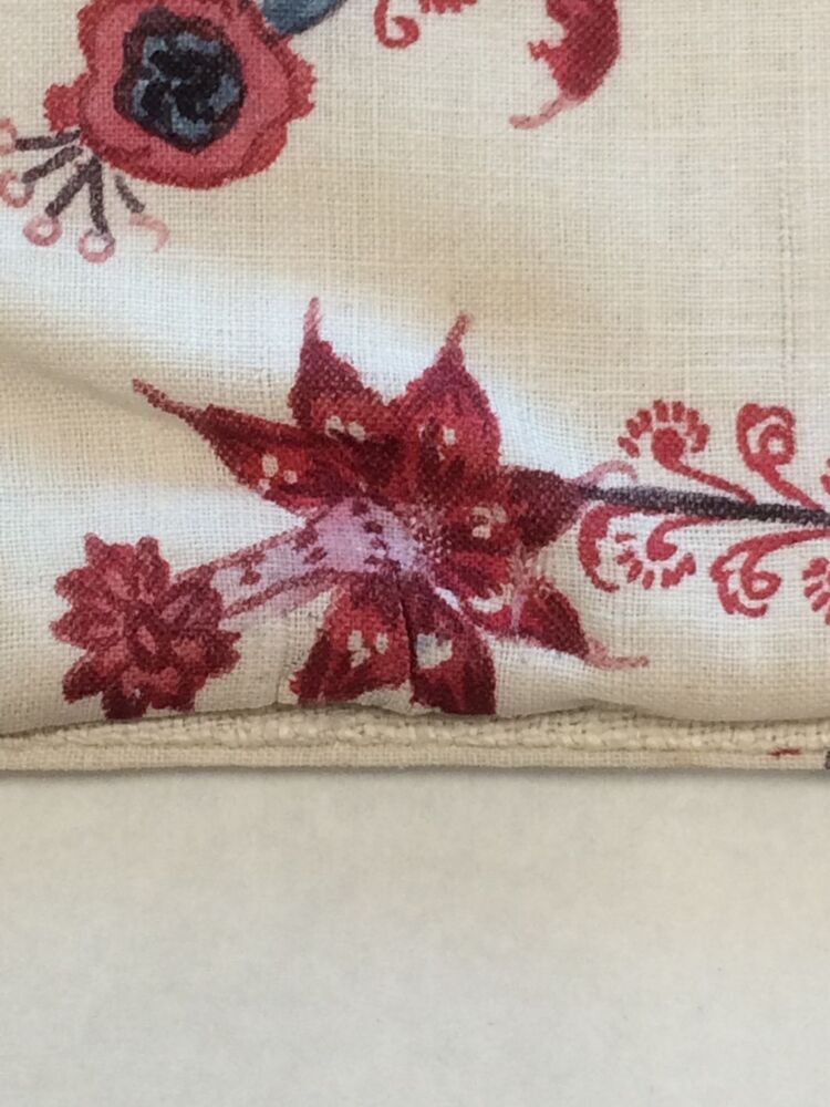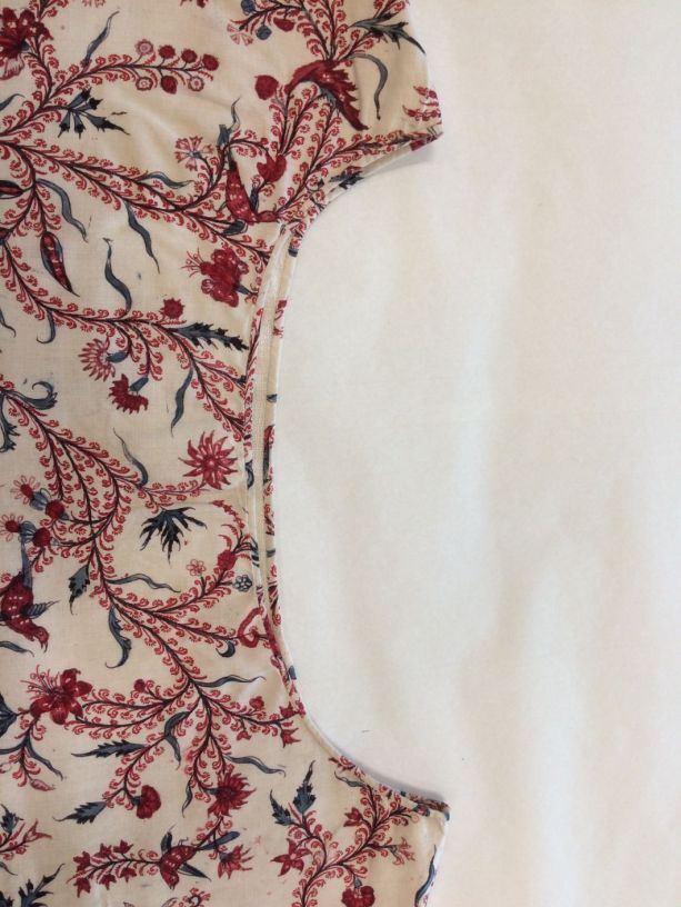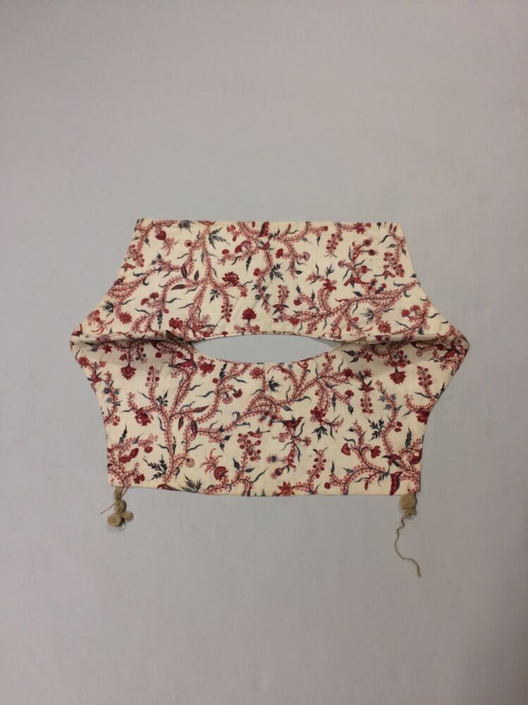 Sitsen vrouwenkroplap ofwel onderst, met dunne wuivende ranken met rode pluisjes, kleine bloemen en vogeltjes op witte grond