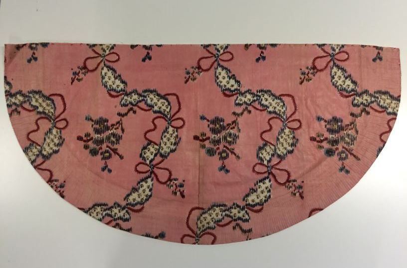 Zonhoedvoering van bedrukt katoen in sitstechniek, incompleet, met gearceerde slingers en bloemen op roze grond