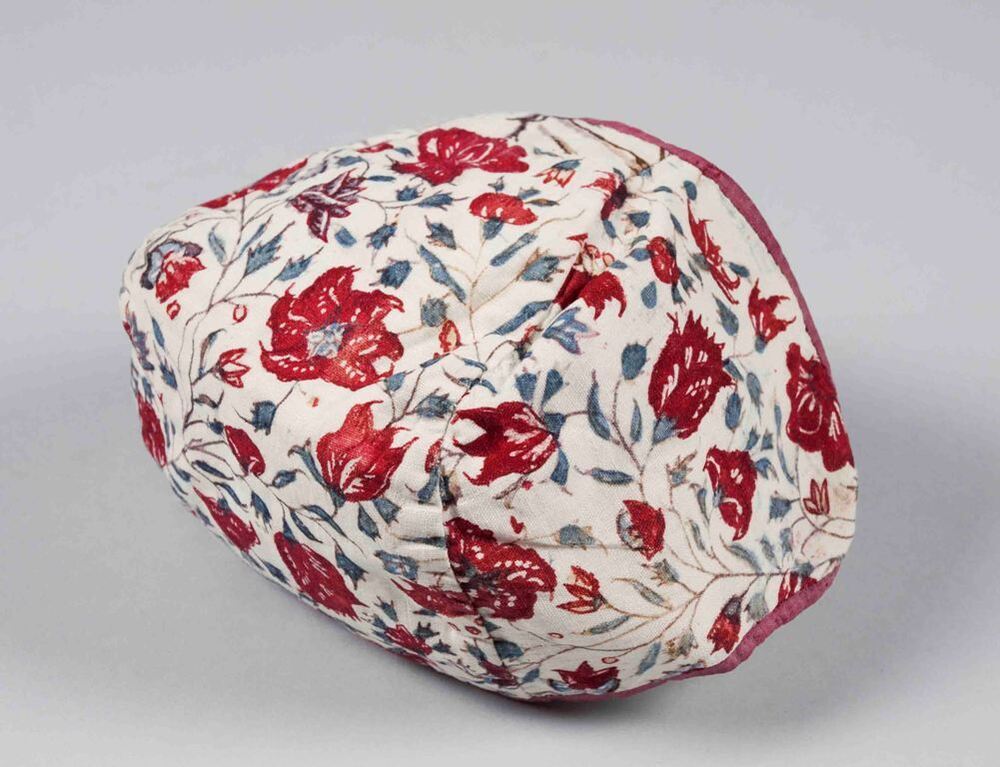 Sitsen meisjesmuts, met dunne bloemranken op witte grond, omboord met rode zijde