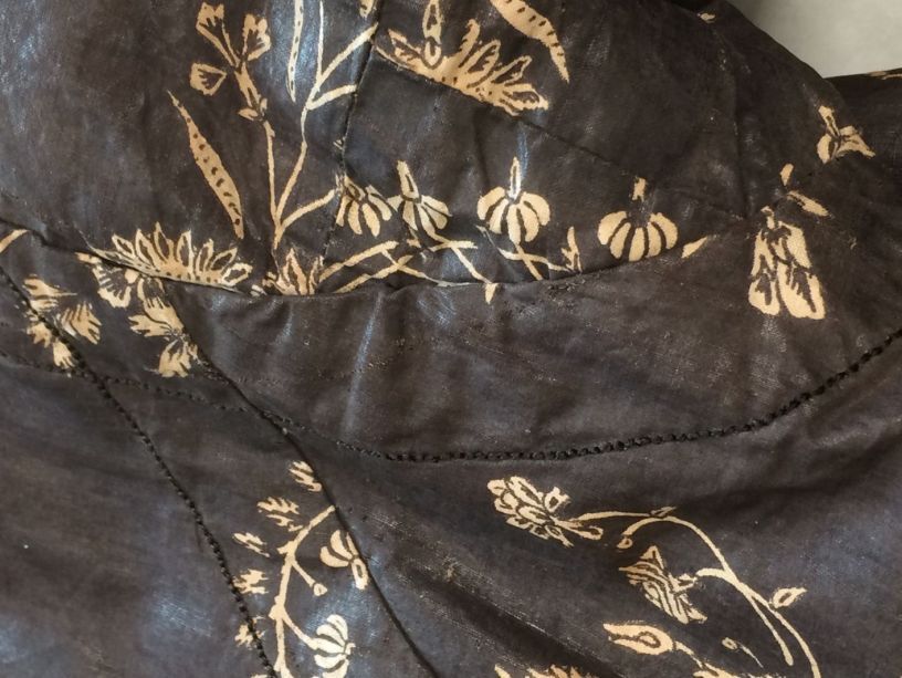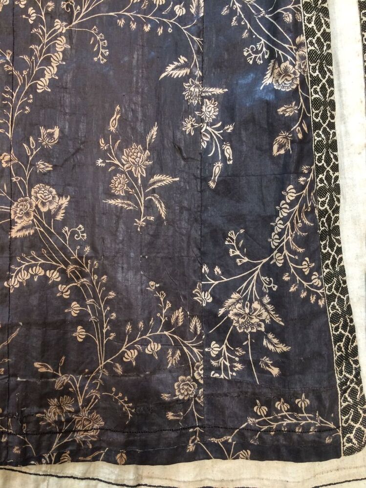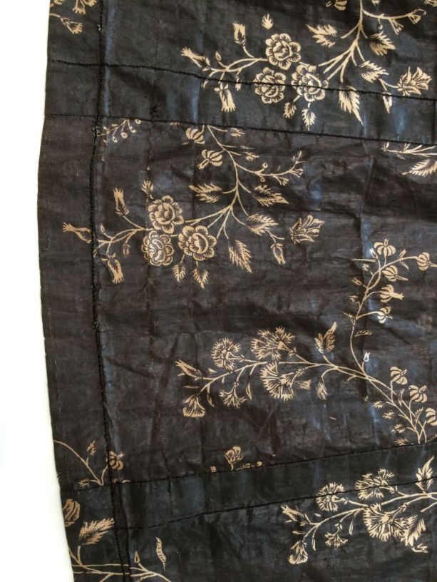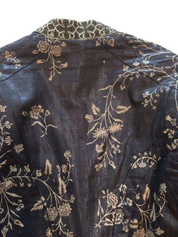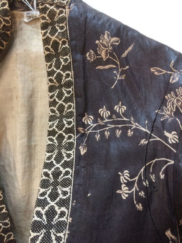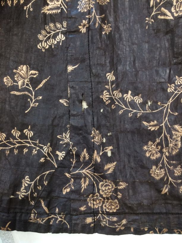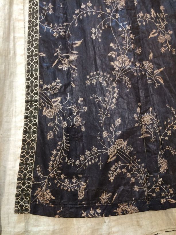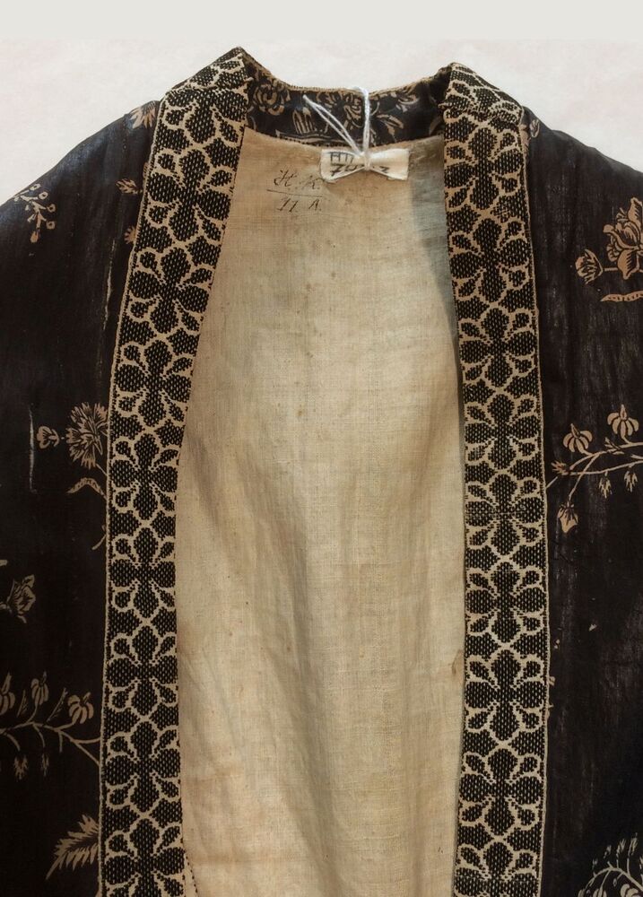 Sitsen Hindeloper wentke, lange vrouwenjas voor de rouw,afgezet met langetband met zwarte motieven, met uitgespaarde witte ranken met bloemen op zwarte grond