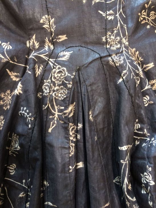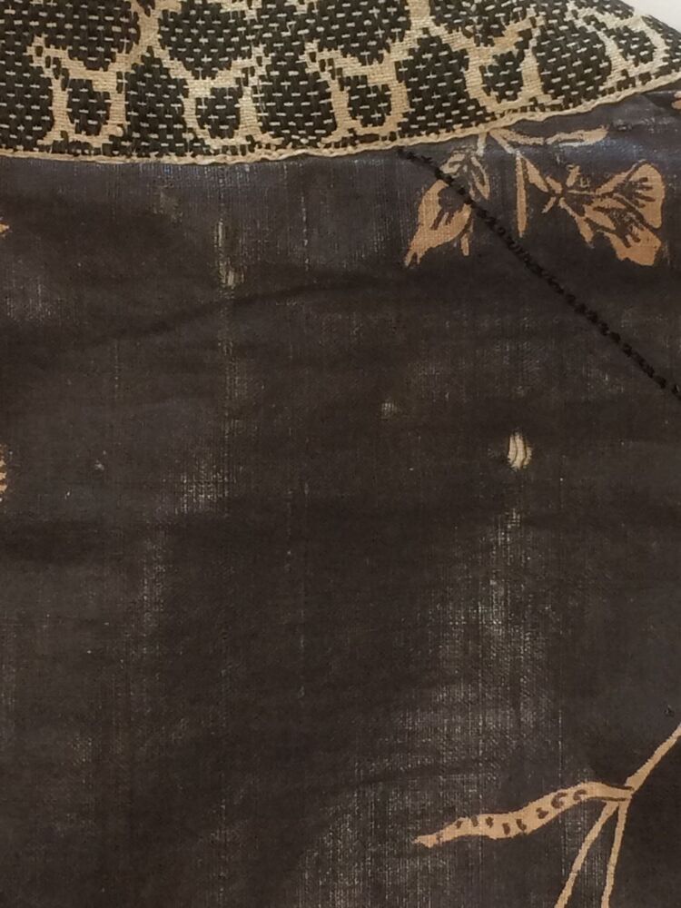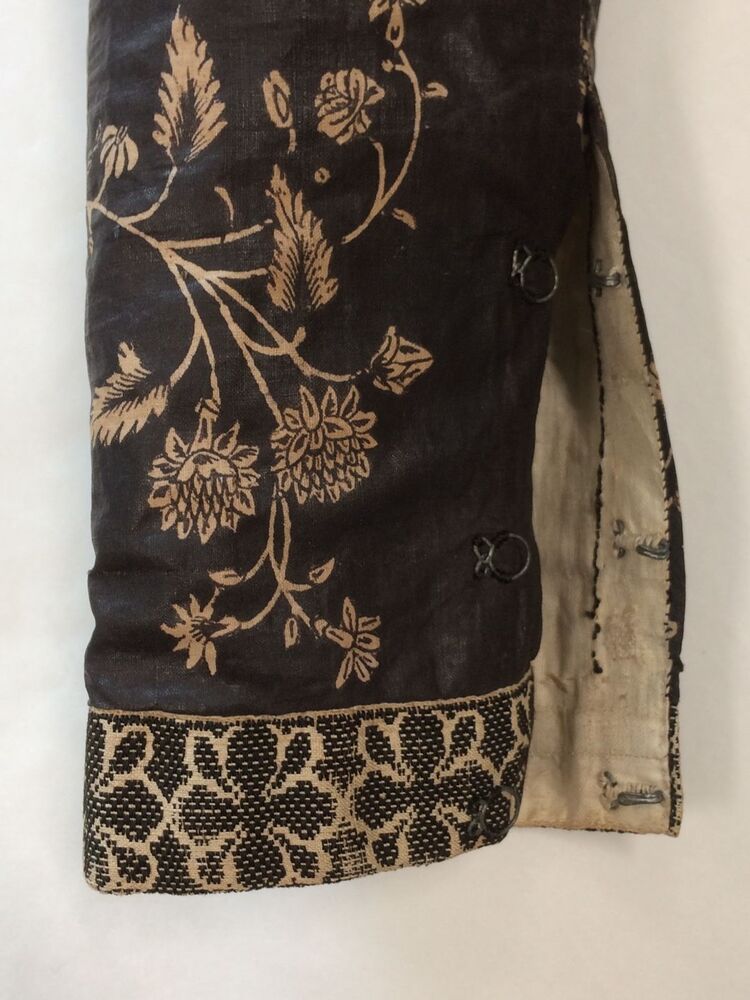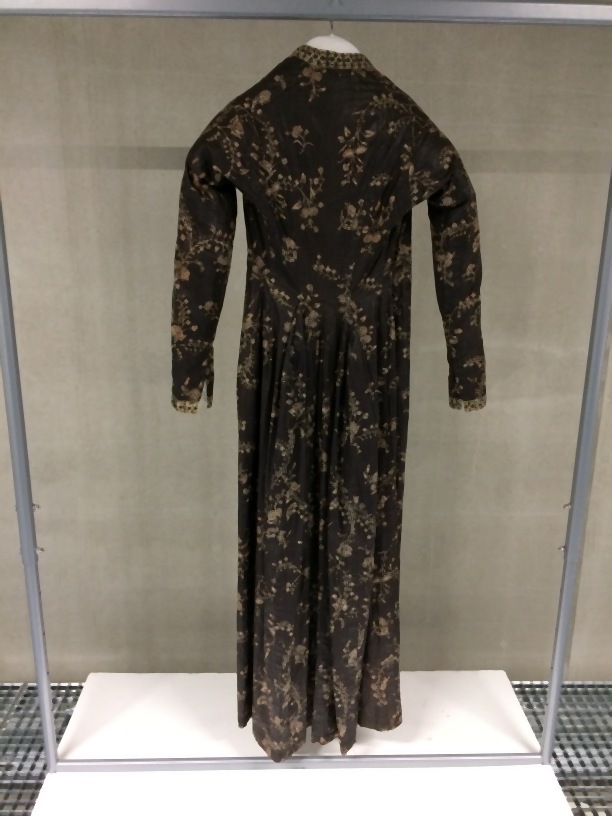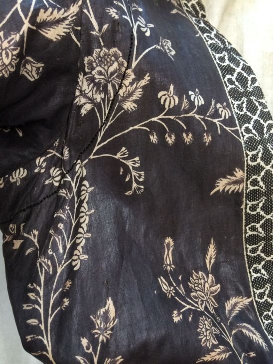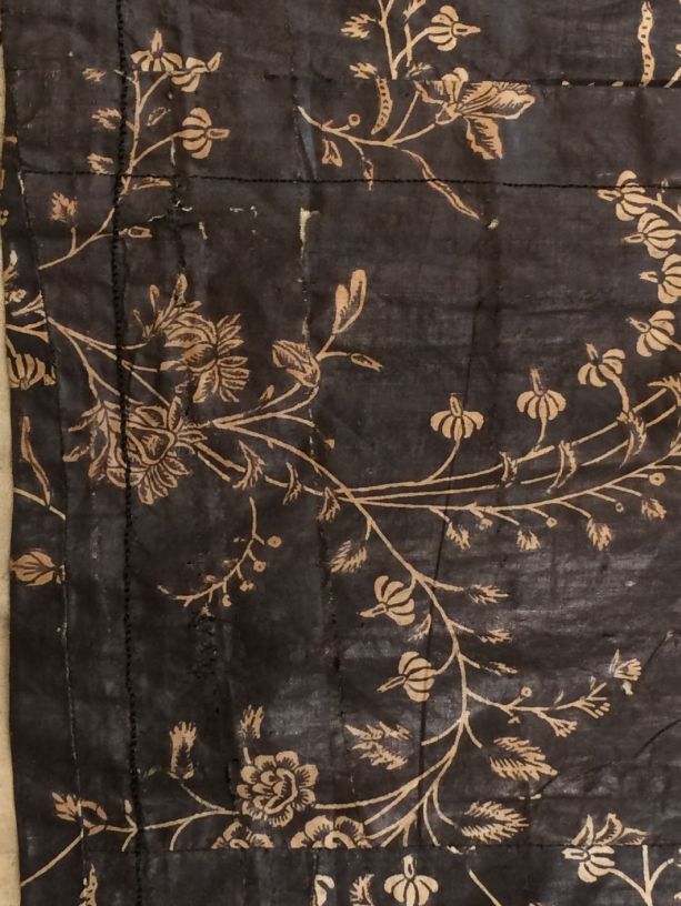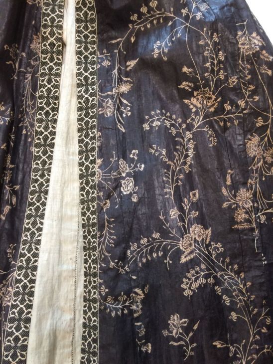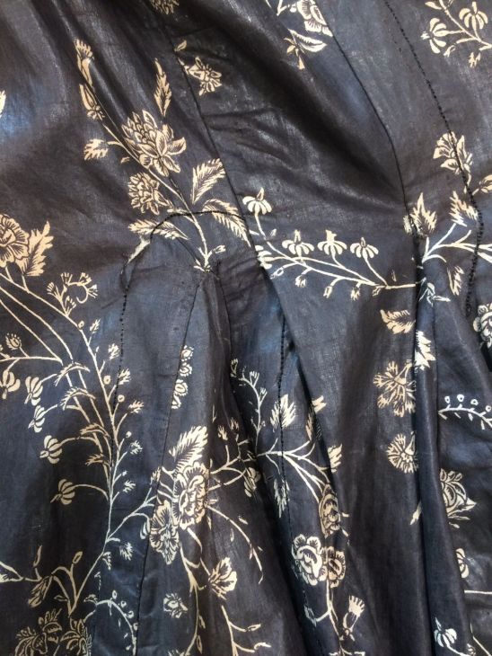Sitsen Hindeloper wentke, lange vrouwenjas voor de rouw,afgezet met langetband met zwarte motieven, met uitgespaarde witte ranken met bloemen op zwarte grond