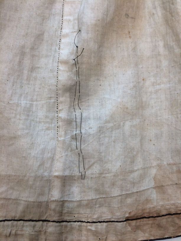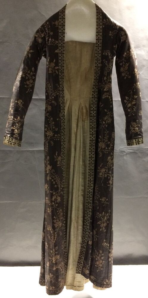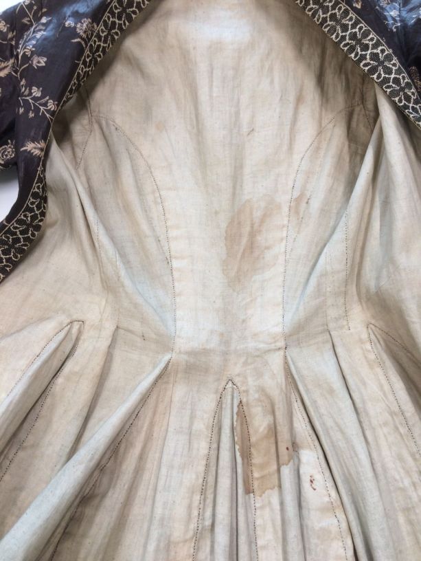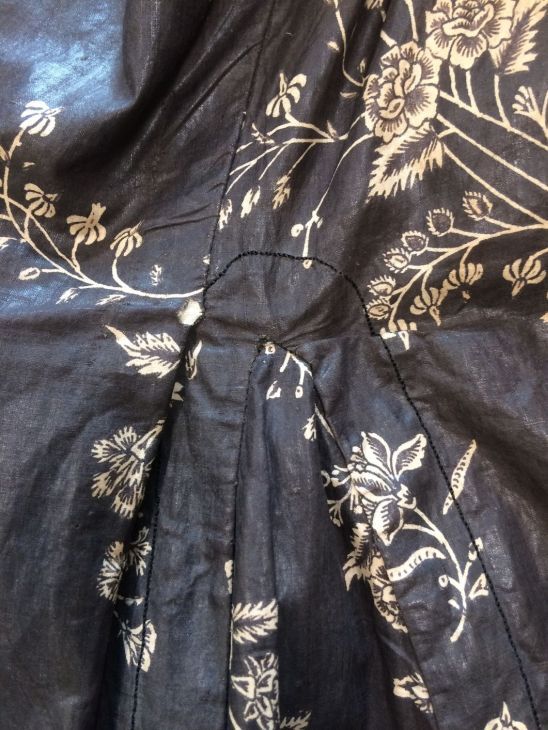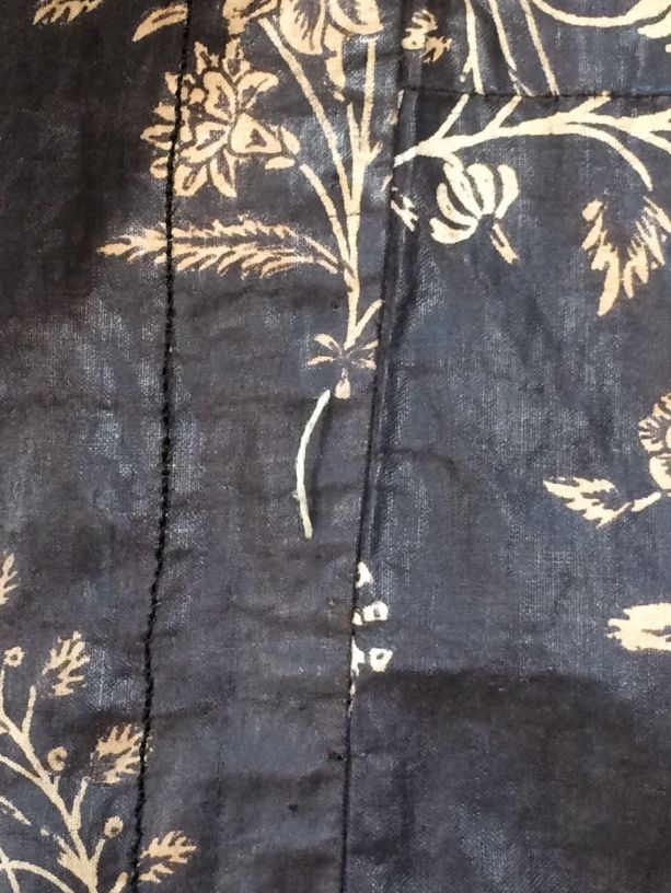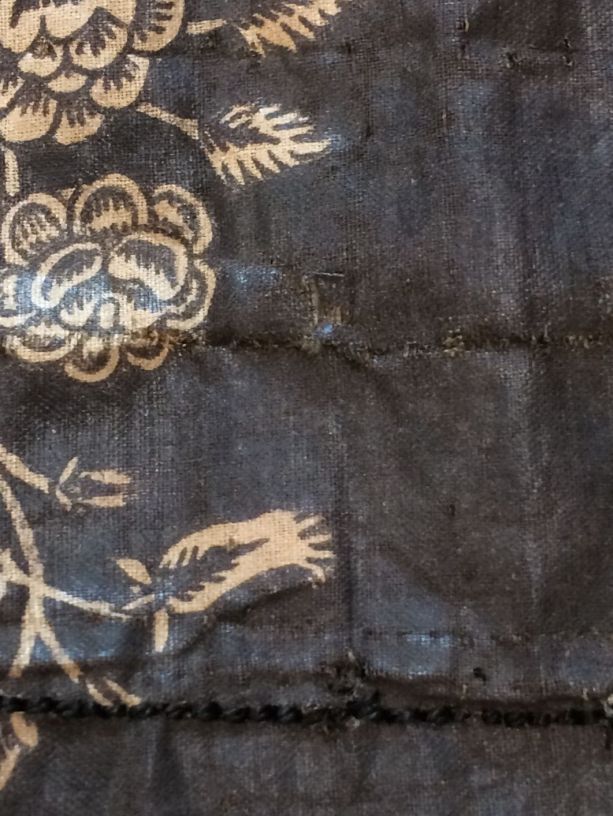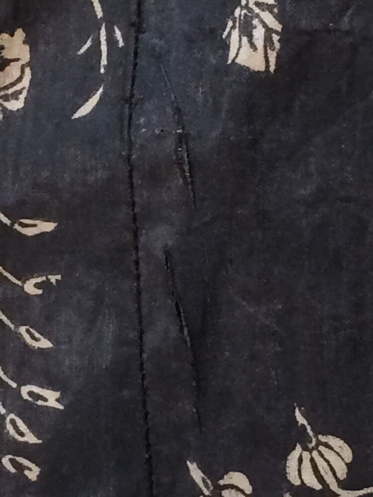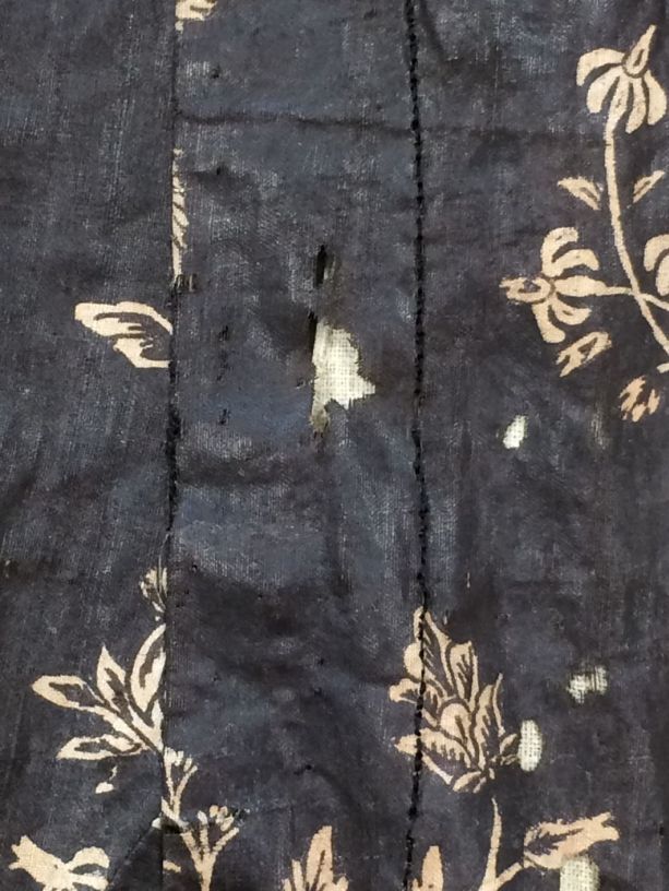 Sitsen Hindeloper wentke, lange vrouwenjas voor de rouw,afgezet met langetband met zwarte motieven, met uitgespaarde witte ranken met bloemen op zwarte grond