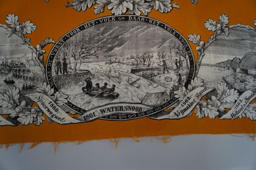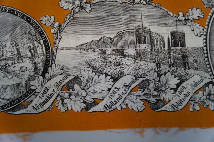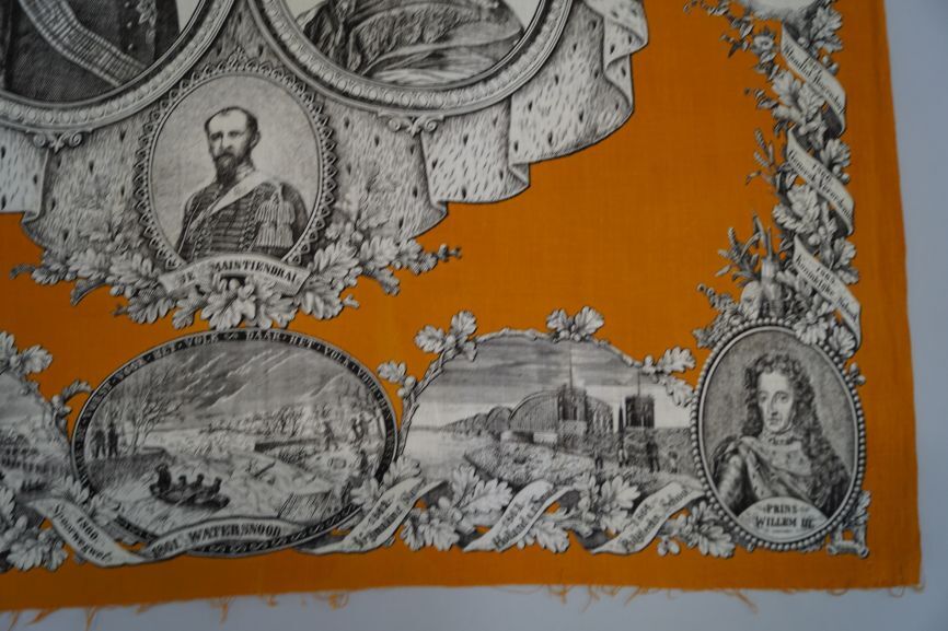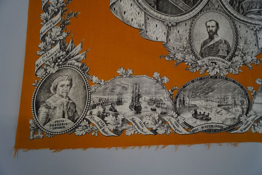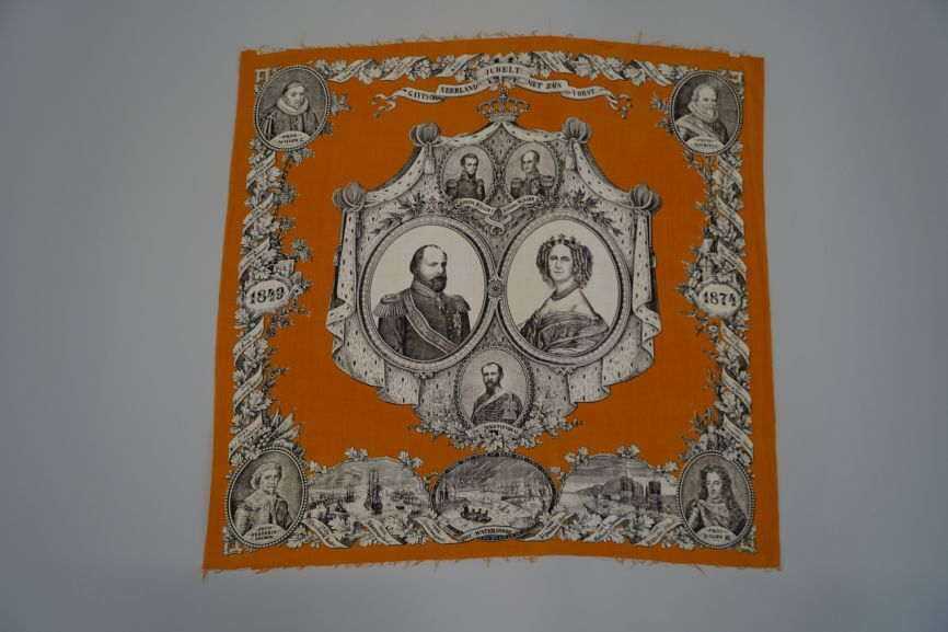 Bedrukte katoenen gedenkdoek ter ere van het 25-jarig huwelijk van Koning Willem III en Koningin Sophie
