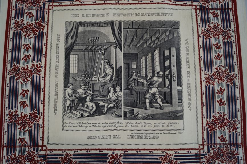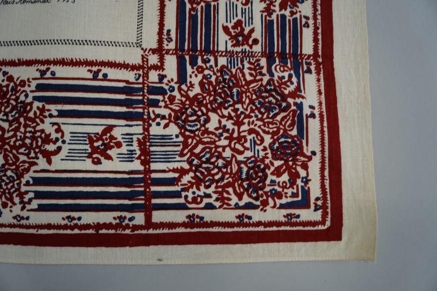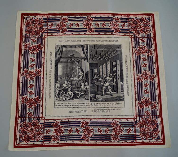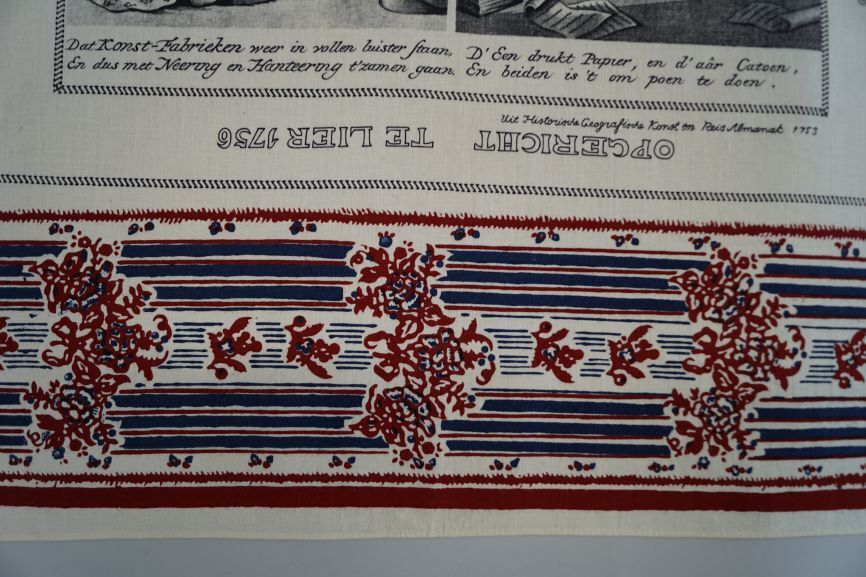 Reclamedoek van bedrukte katoen van de Leidse Katoen Maatschappij, met rood-blauw gekleurde rand