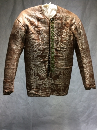 Hemdrok of baeitje van lichtbruine zijde met ingeweven zilvergrijs bizar floraal motief en groene knoopsgaten