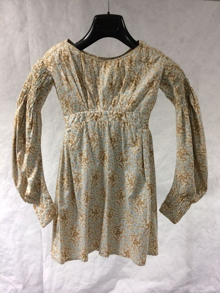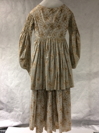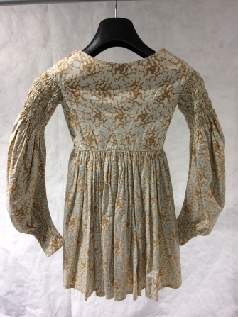 Biedermeier kostuumjak van wit katoen bedrukt met bruine grillige figuren en blauwe stippen met schapeboutmouw en lange schoot