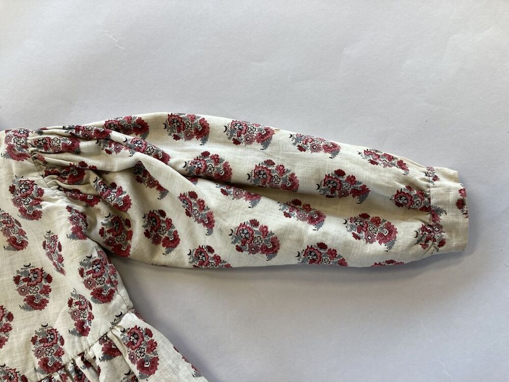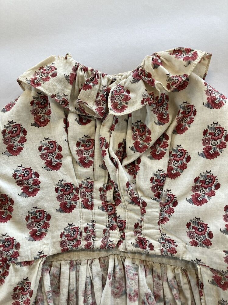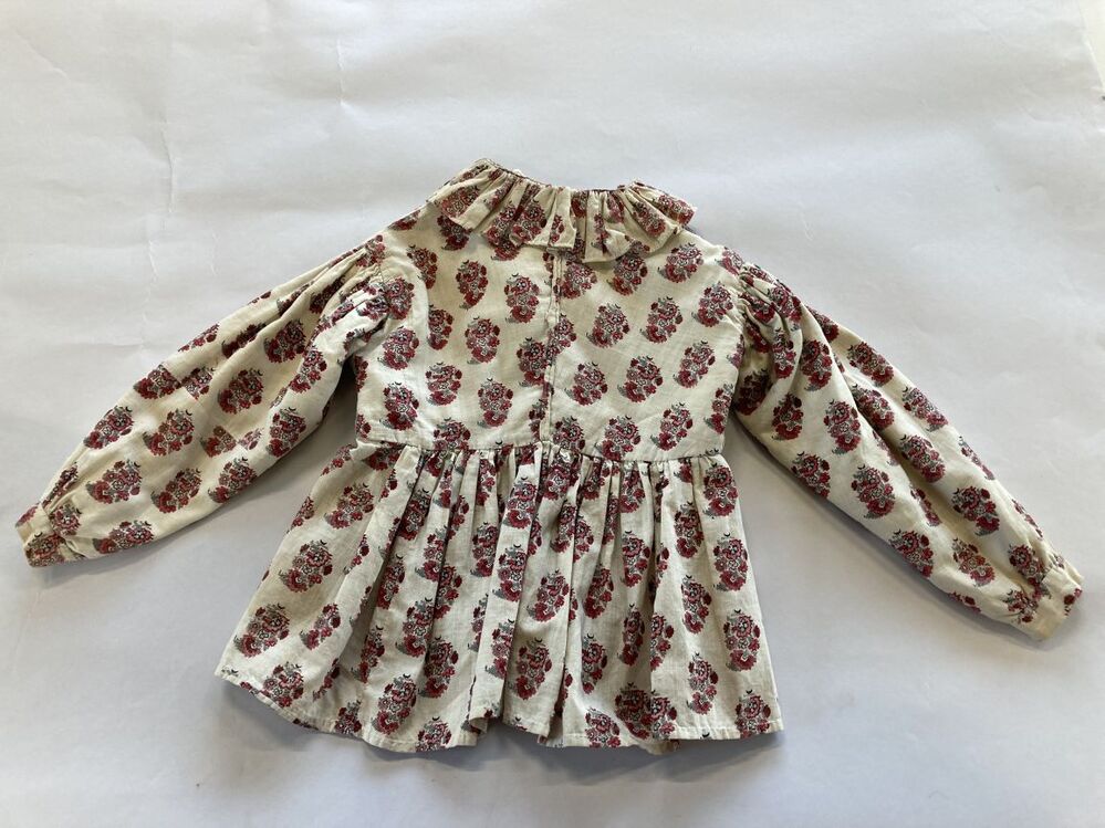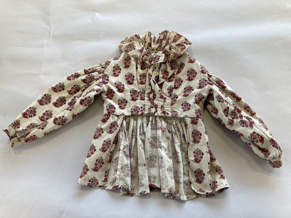 kinderjakje met lange pofmouwenen gerimpelde kraag met schoot, van bedrukt katoen met butamotiefjes