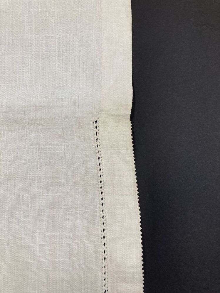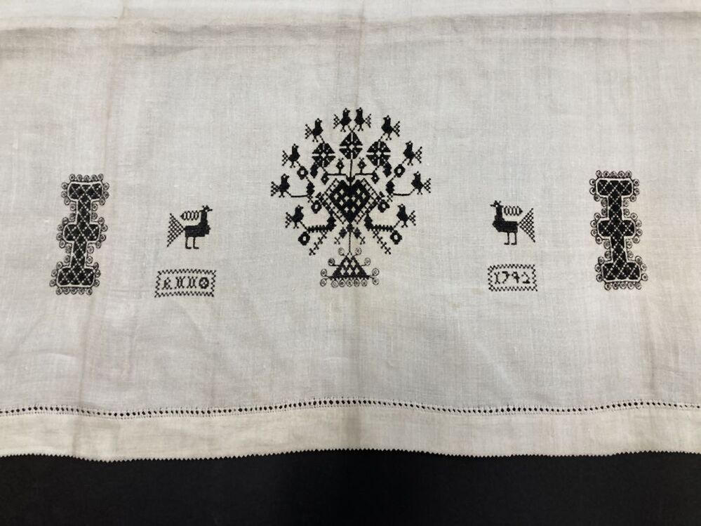 Klein wit linnen lakentje met zwart zijden monogram II 1742, opengewerkte zoom en afgewerkt met puntjes