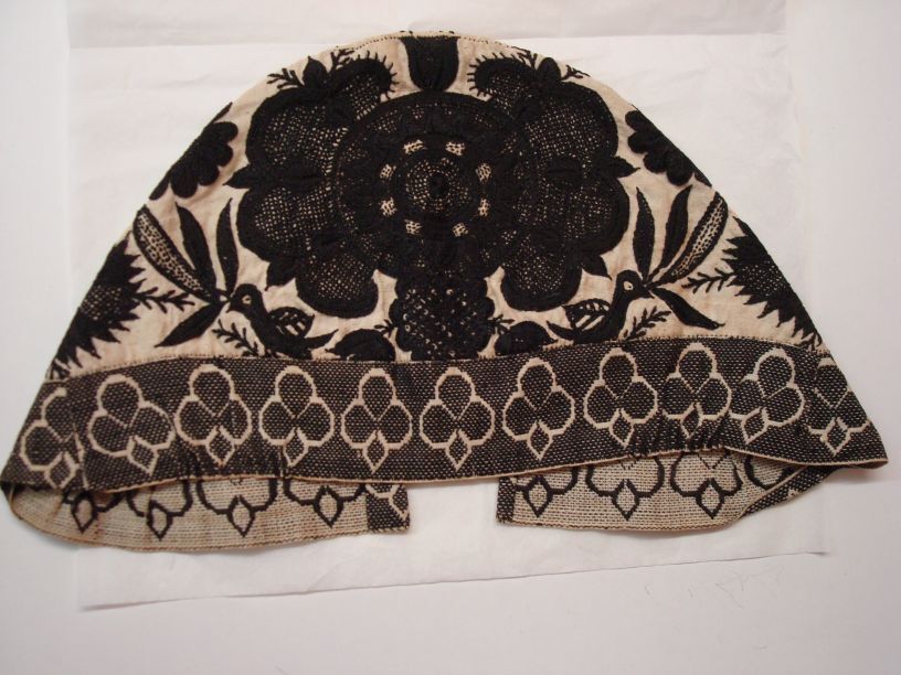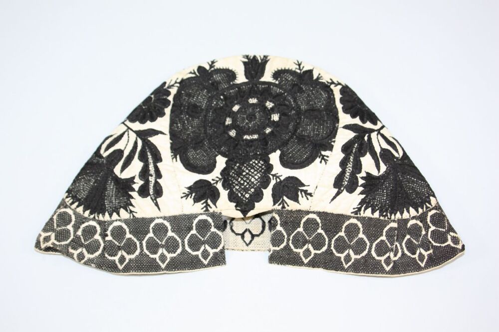 Linnen huismuts, afgezet met zwart-wit langetband, geborduurd met zwarte zijde met grote ovale bloemmotieven met vogels