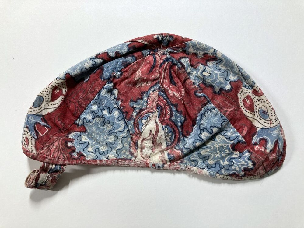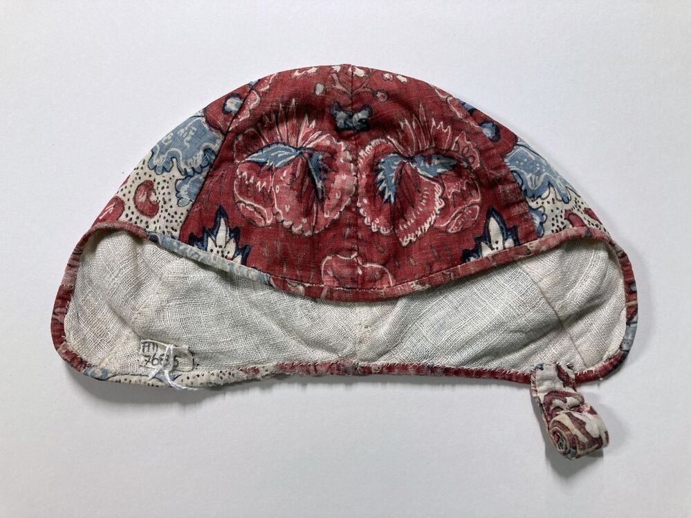 Sitsen jongensmuts, met bizarre bloemmotieven op rode grond