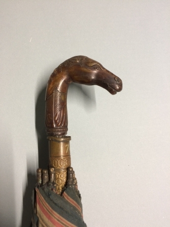 Paraplu bekleed met blauw sanella met rode streeprand, de hoornen knop in vorm van paardenkop