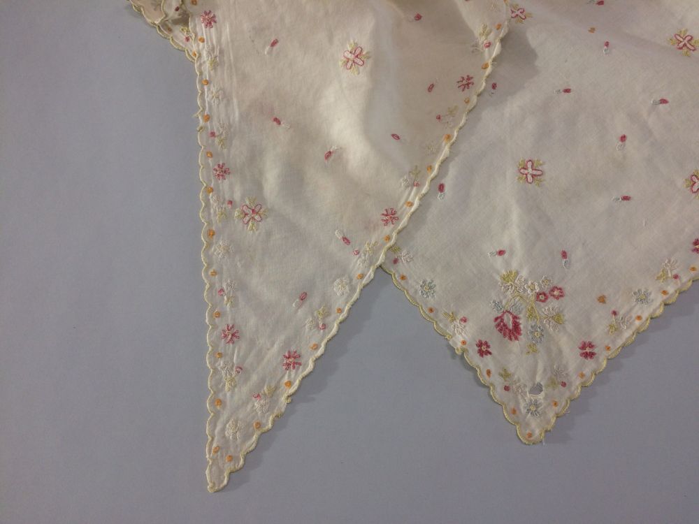 Driekante witte doek bezaaid met getamboereerde kleine rode en blauwe ovale stippen en bloempjes en rand rondom