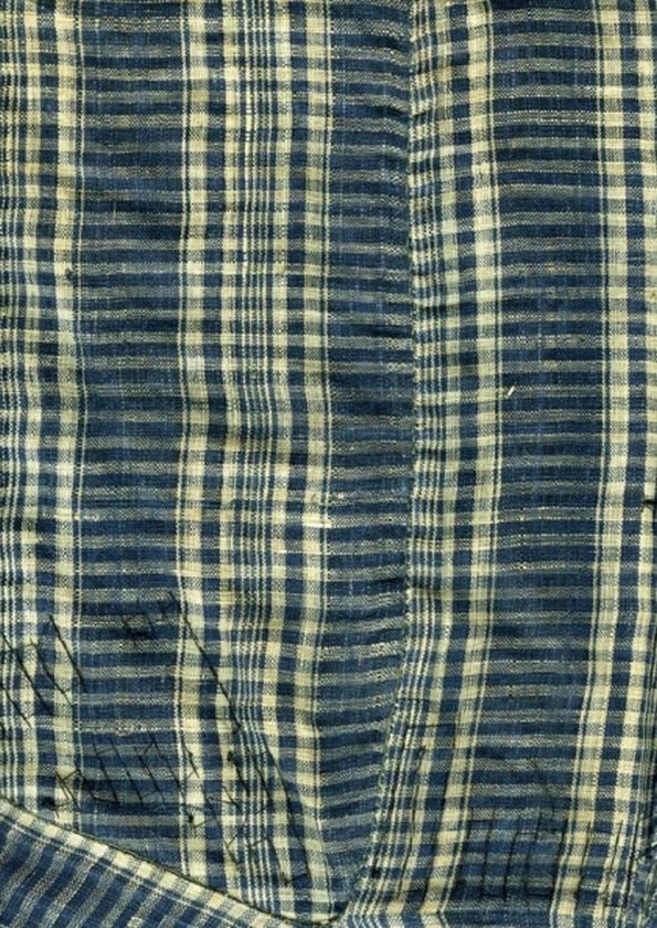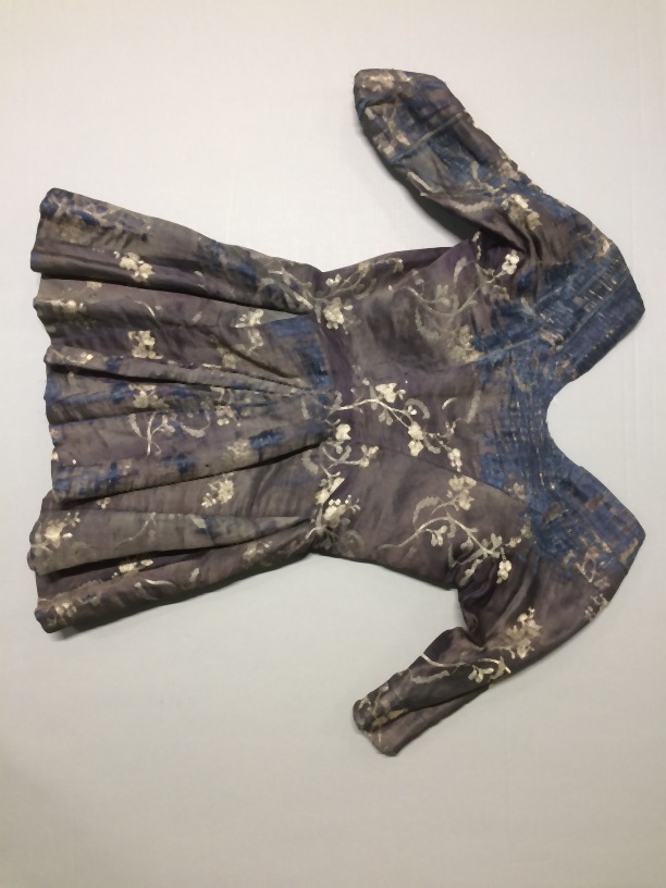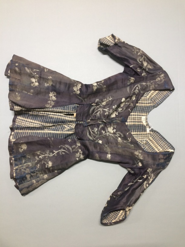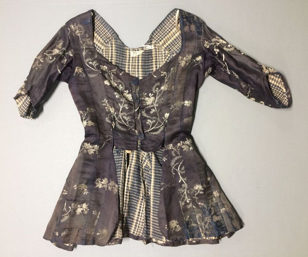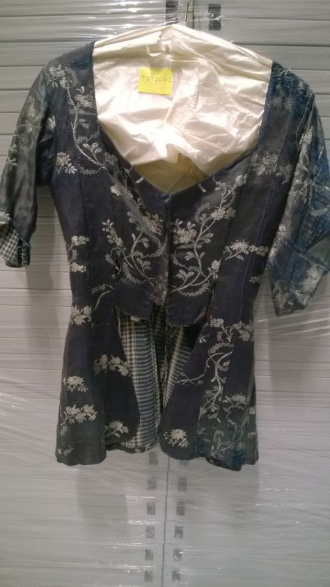 Jak van blauw zijde-linnen met ingeweven bloemen in de kleuren wit en lichtblauw, onderdeel kostuum levensgrote pop