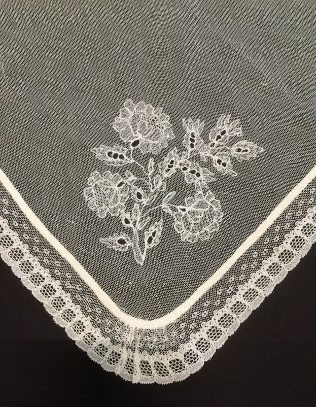 Witte tule fichu met langs alle zijden machinale kloskant en een geborduurde bloemtak in de punt