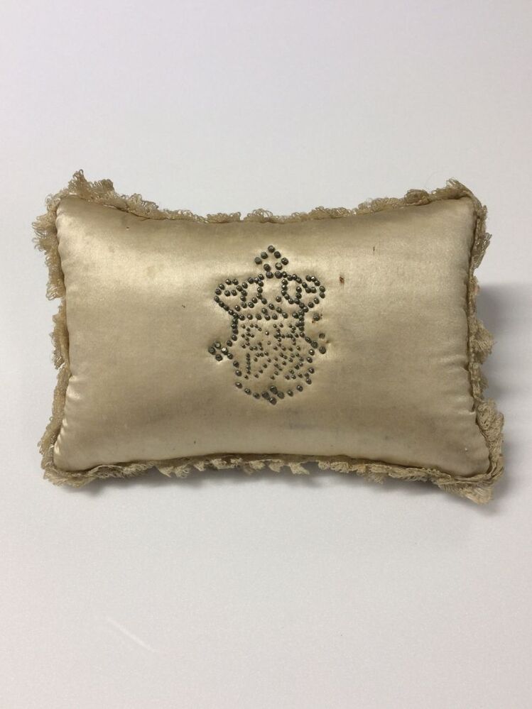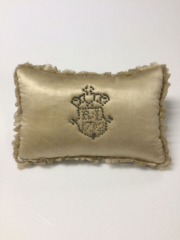Wit satijnen speldenkussen met kroon en schild waarop F H 1792