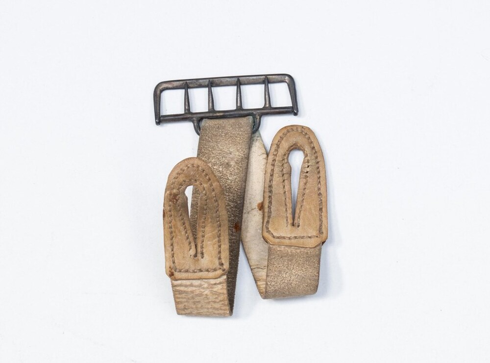 Metalen gesp met wit leren band met knoopsgaten, bevestiging voor bretels, onderdeel van groep van twee
