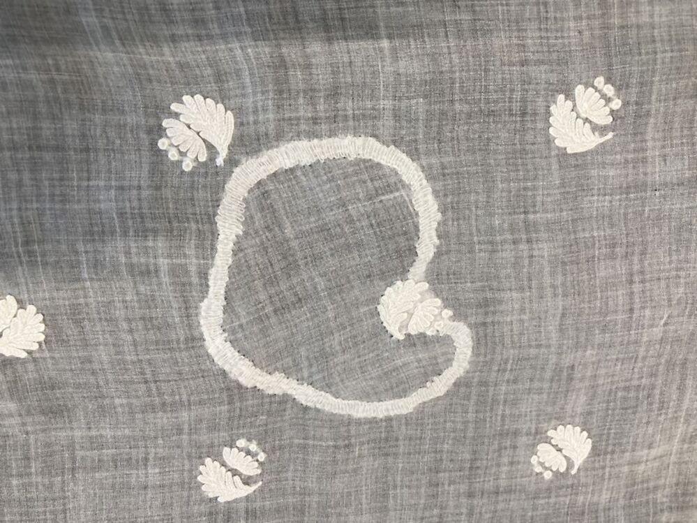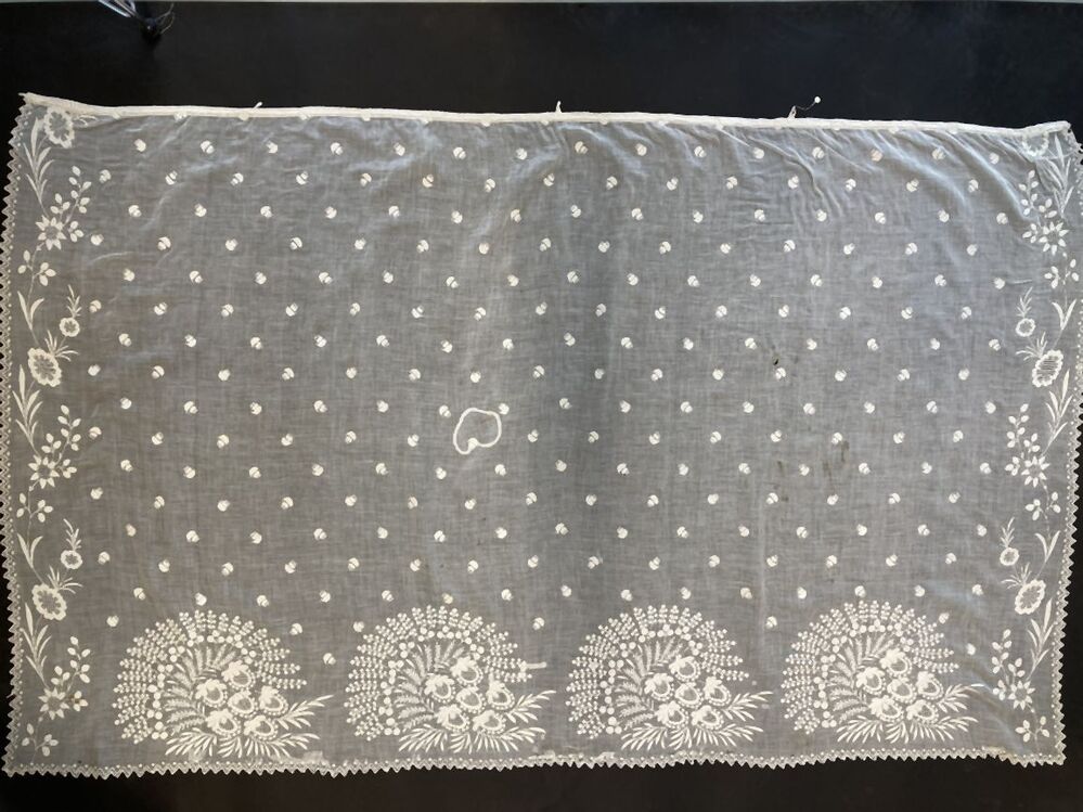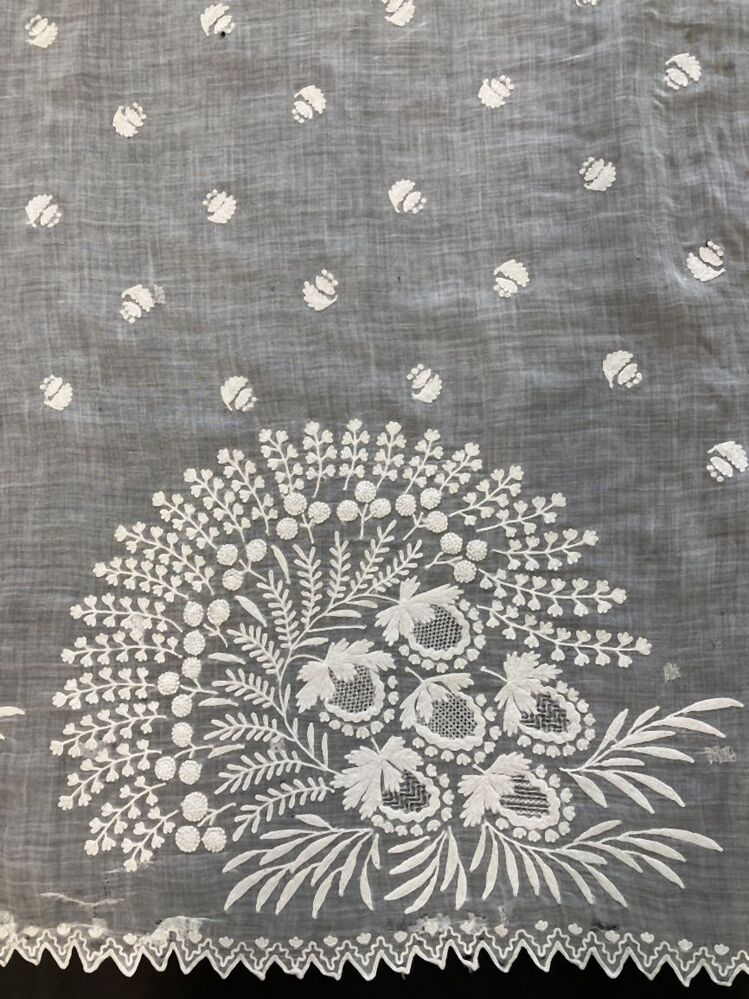 Schort van getamboereerd batist met bloem-boeketten, randen en strooimotiefjes.