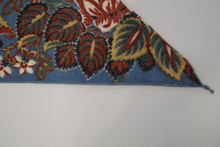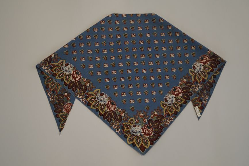 Driekante doek met blauw fond, bedrukt met kleine bloemen en rozenrand