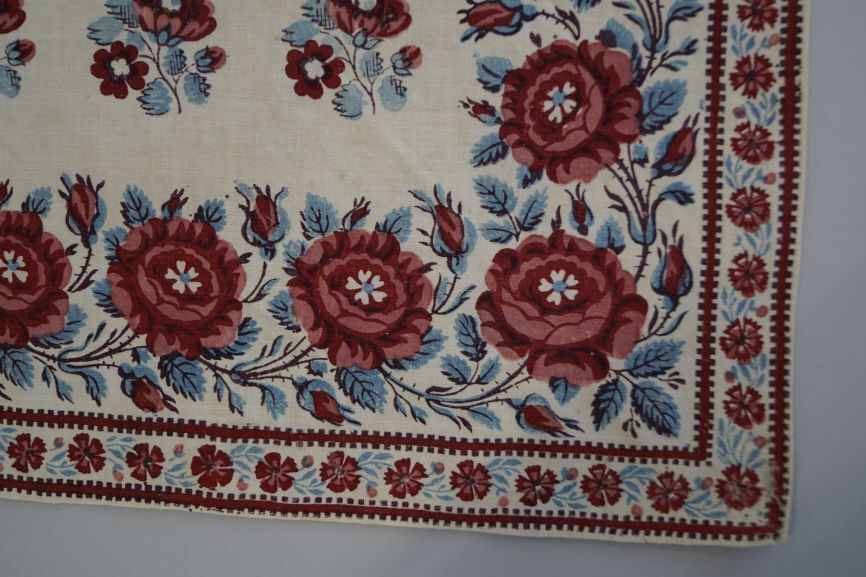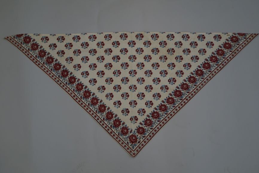 Driekante witte katoenen doek bedrukt met boeketjes en rozenrand