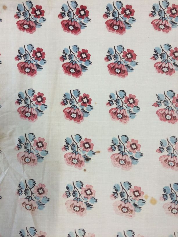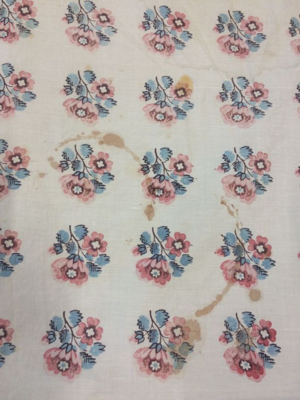 Halsdoek van bedrukt katoen in sitstechniek met boeketjes, rozenrand en afsluitend randje