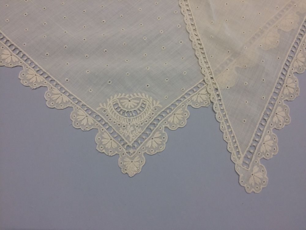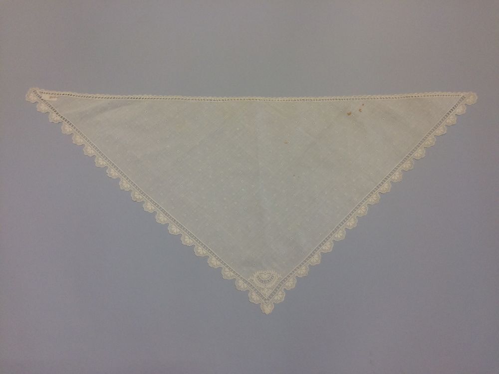 Driehoekige witte fichu met Engels borduurwerk met opengewerkte rand met schulpen