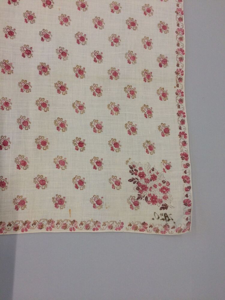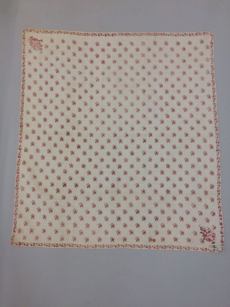 Vierkante bedrukte katoenen doek of sjaal metbezaaid met kleine boeketjes en smalle rand met bleorank op wit fond
