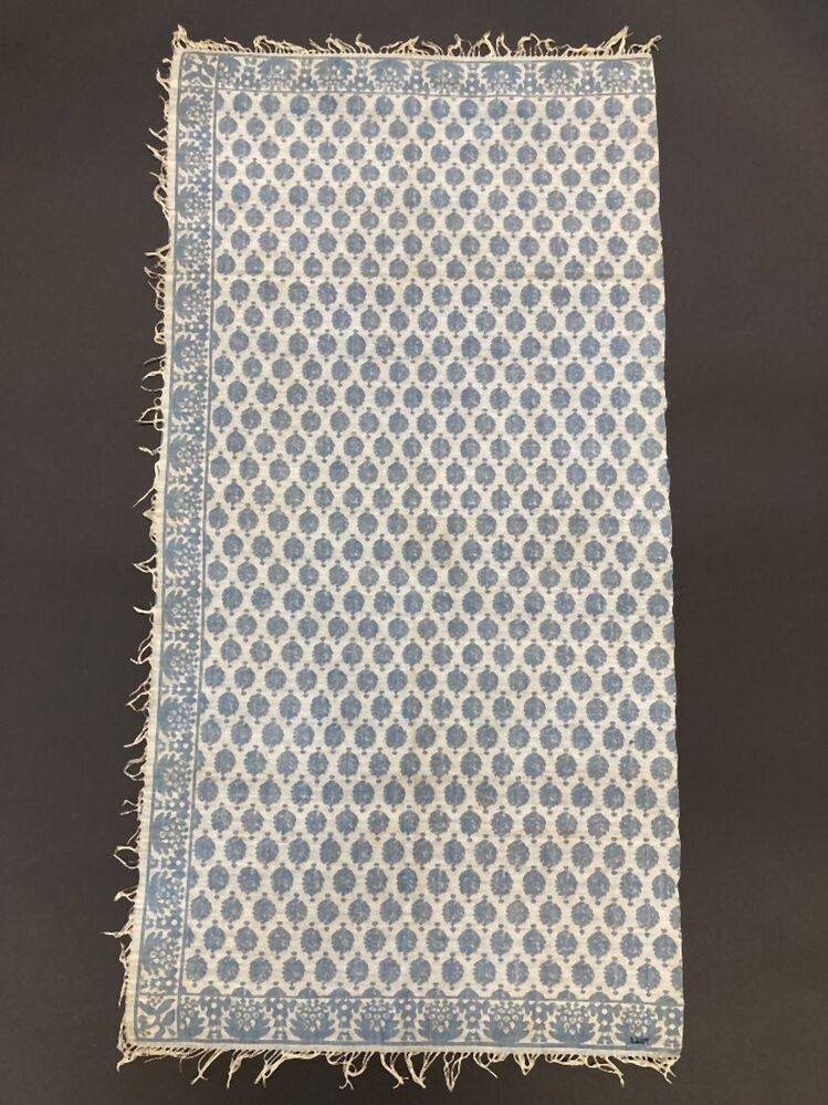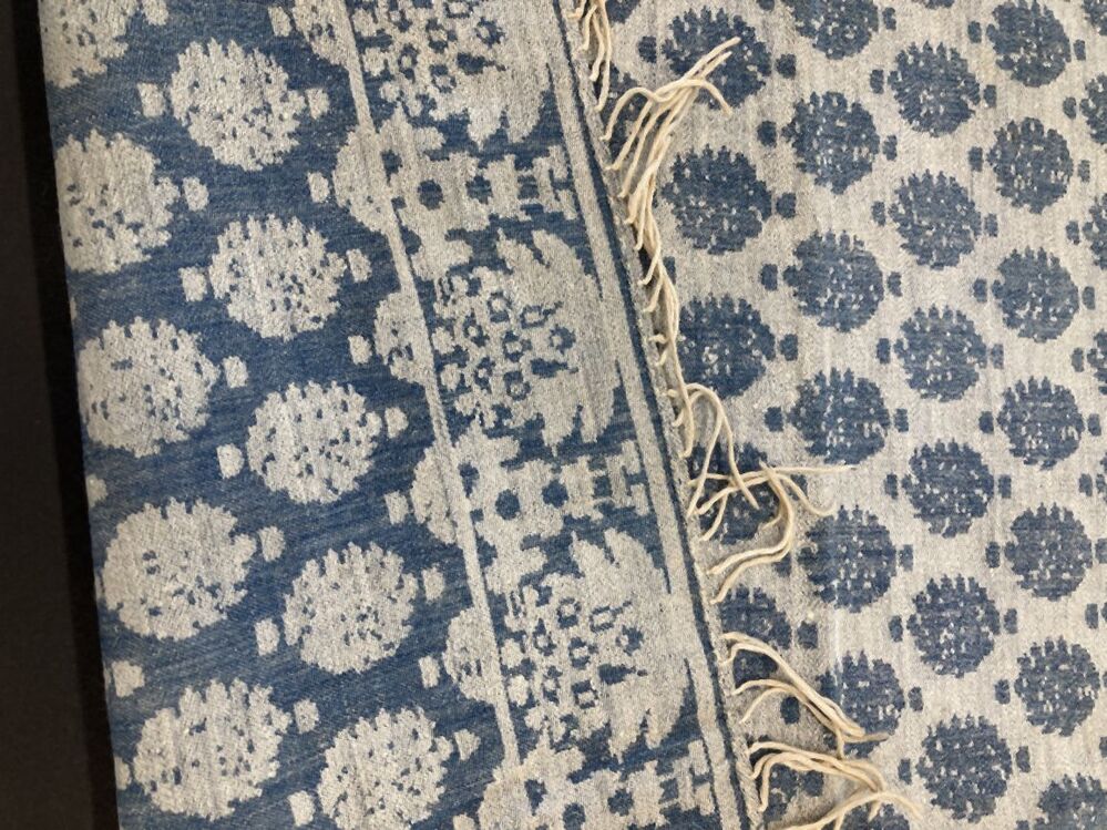 Doek van blauw-witte damast, rand en figuren van donkerblauw met aan drie zijden franje