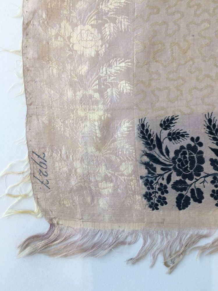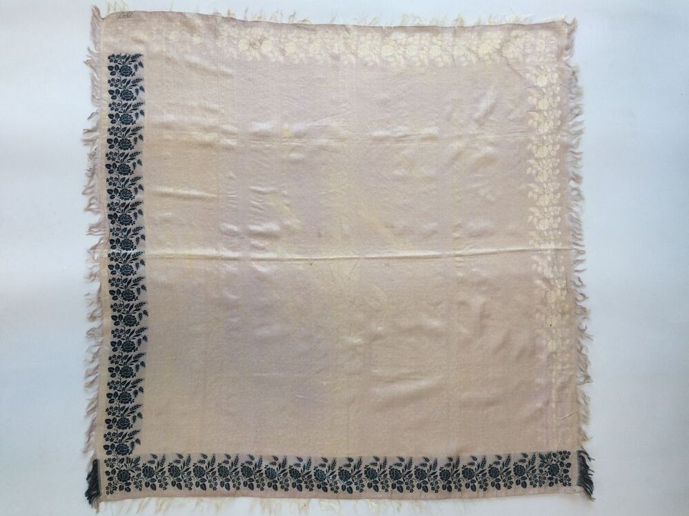 Zijden lilakleurige sjaal met twee donkerblauwe en twee ecru randen