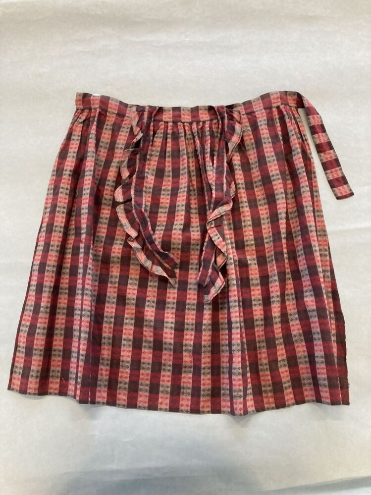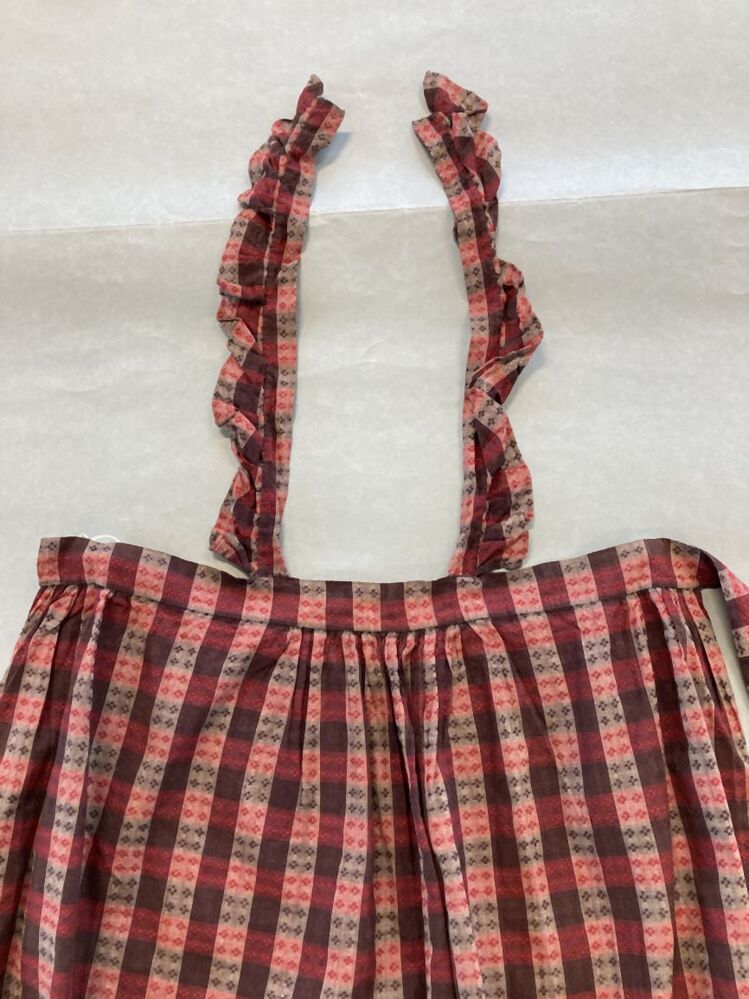 Boezelaar of schort van katoen, ingeweven ruit met geometrische motiefjes, rood, bruin, en wit