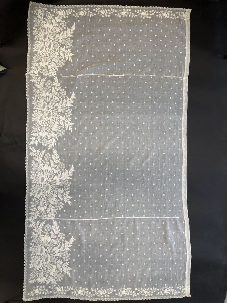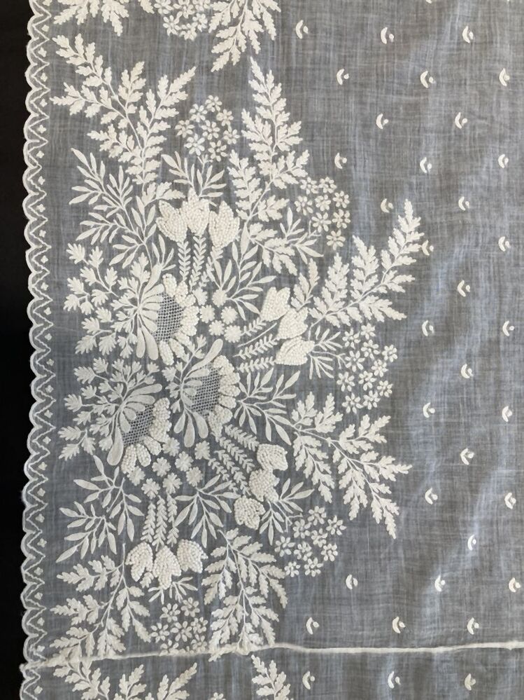 Sierschort van witte voile met geschulpte rand, met bloem- en tak- patroon geborduurd