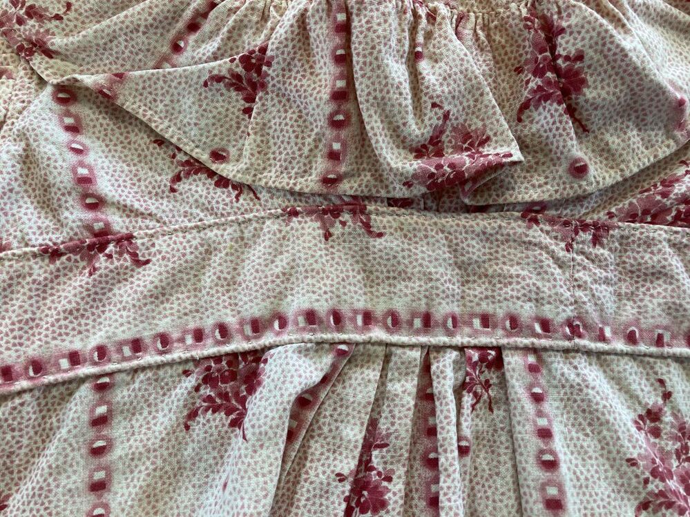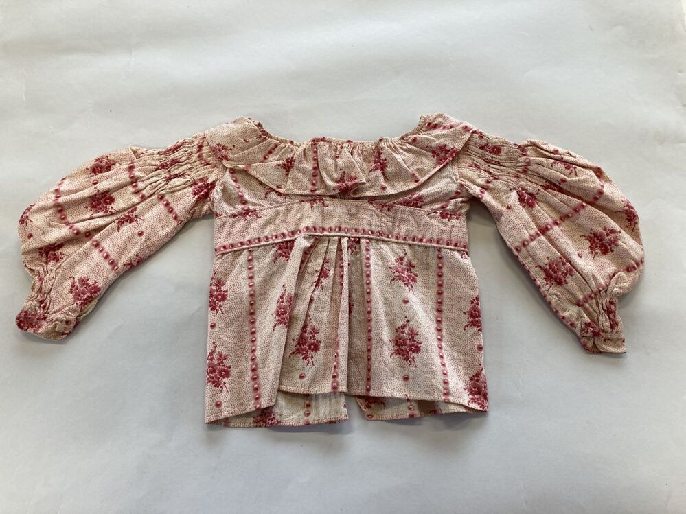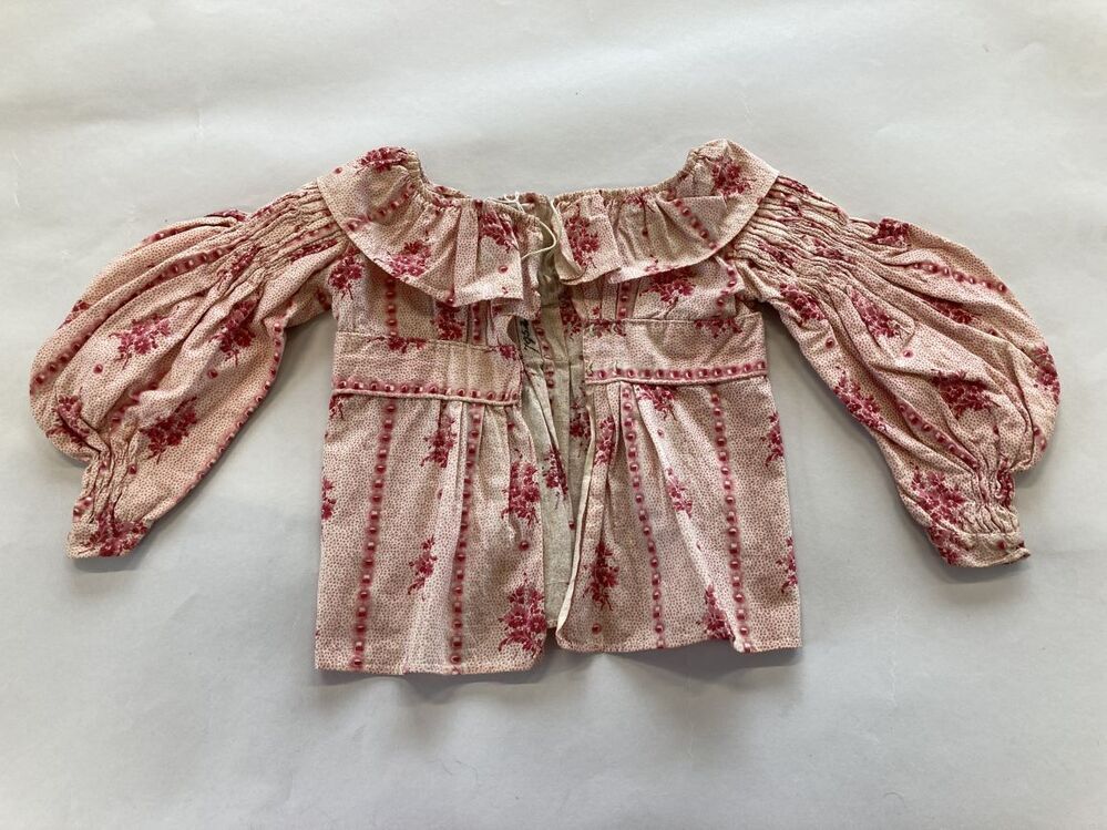 Meisjersjakje van bedrukte katoen, met schapenboutmouwen van roze gestippeld met boeketjes